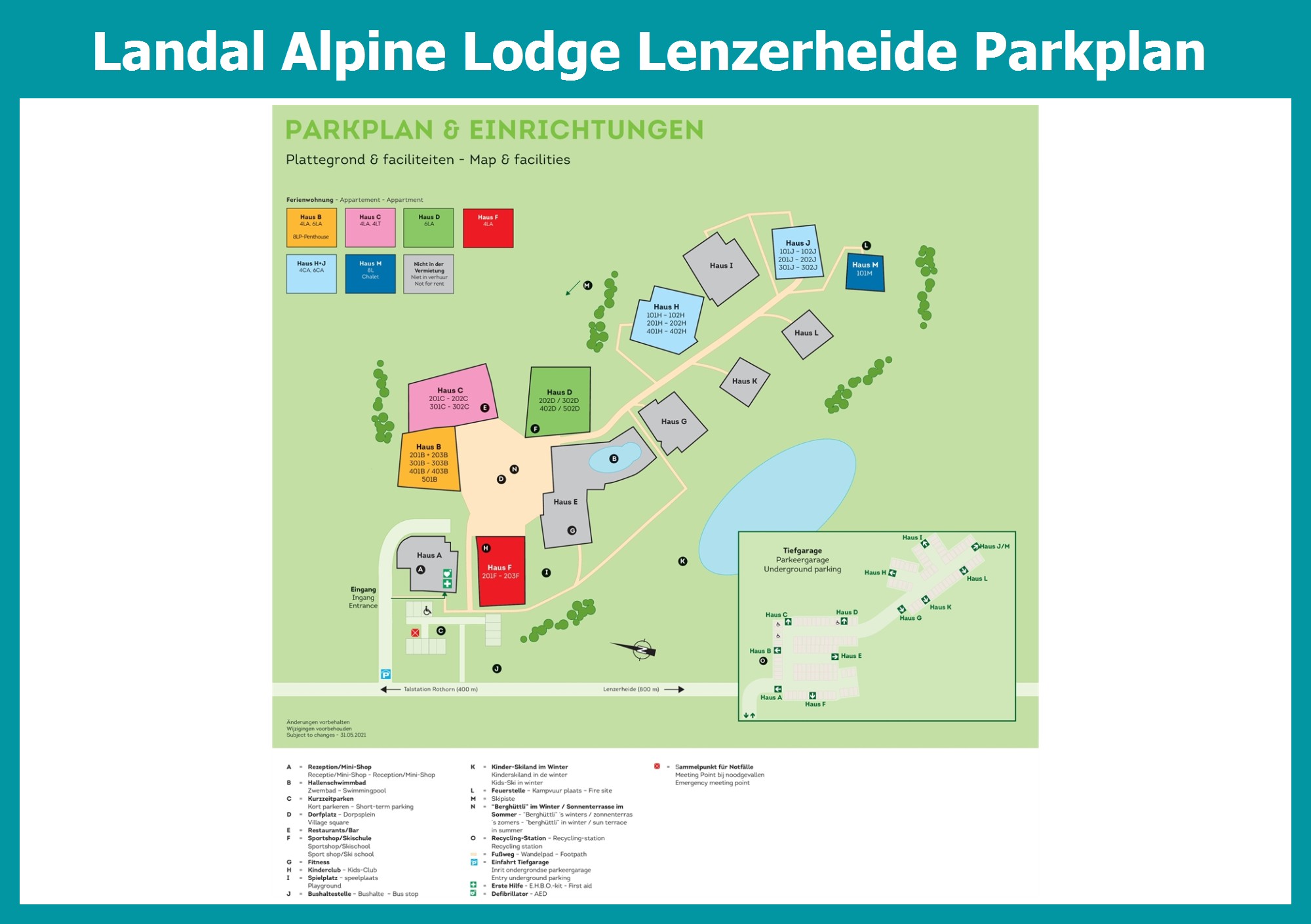 Aktueller und übersichtlicher Parkplan von Landal Alpine Lodge Lenzerheide mit alle Unterkünfte und Einrichtungen, auch als PDF herunterladbar.