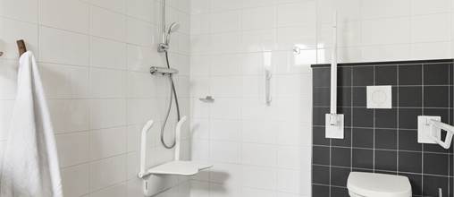 - Angepasstes Badezimmer mit Dusche mit Bügeln, festem Duschsitz, erhöhtem WC mit Haltegriffen, unterfahrbarem Waschbecken (mindestens 78 cm), Spiegel und einem Rollstuhlwendekreis von mindestens 150 cm