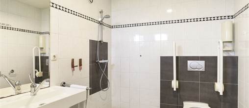 - Angepasstes Badezimmer mit Badewanne, Dusche mit Bügeln, festem Duschsitz, unterfahrbarem Waschbecken (mindestens 78 cm), verstellbarem oder langem Spiegel und einem Rollstuhlwendekreis von mindestens 150 cm und feste Hebeeinrichtung