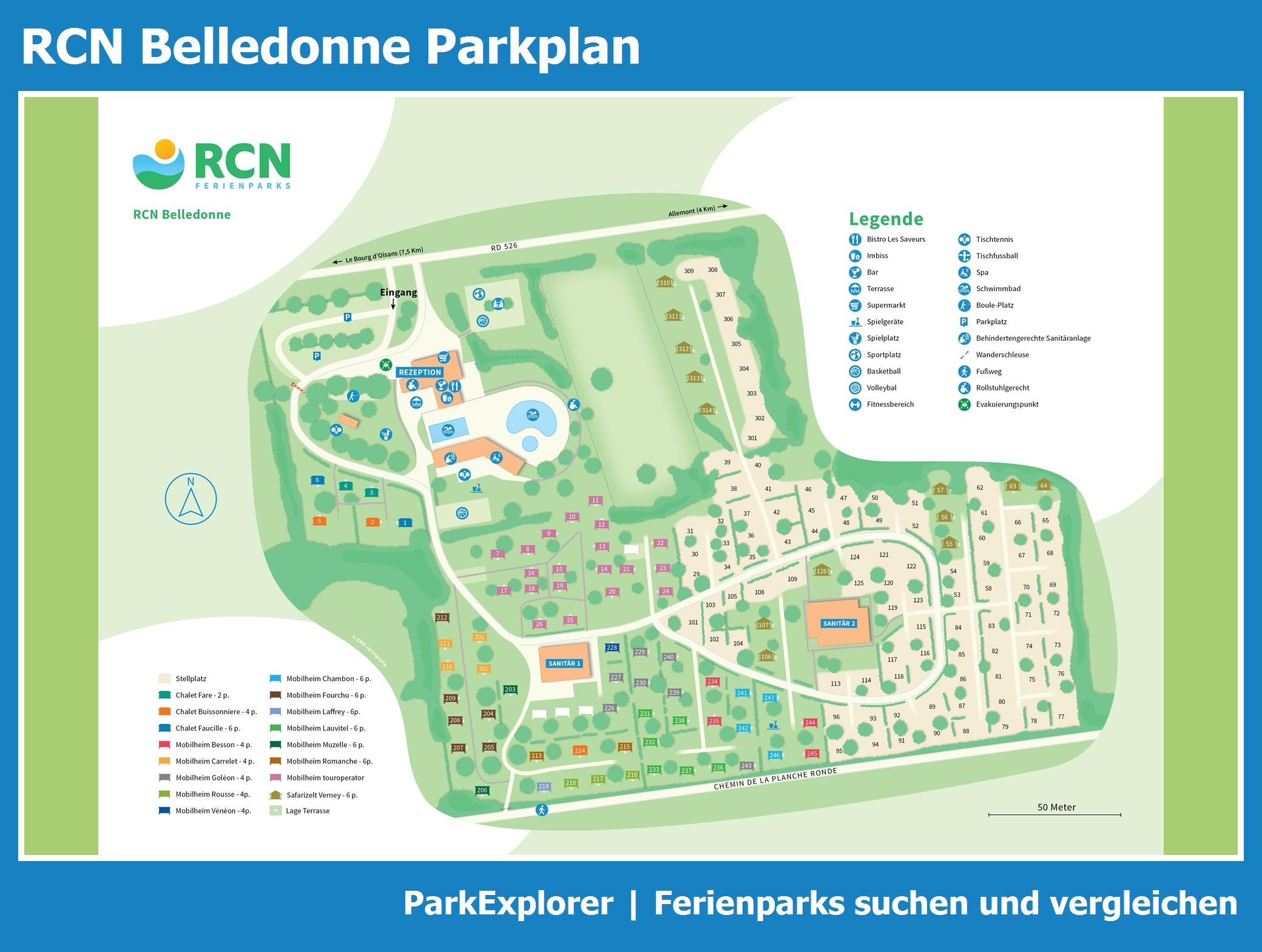 Aktueller und übersichtlicher Parkplan von RCN Belledonne mit alle Unterkünfte und Einrichtungen, auch als PDF herunterladbar.