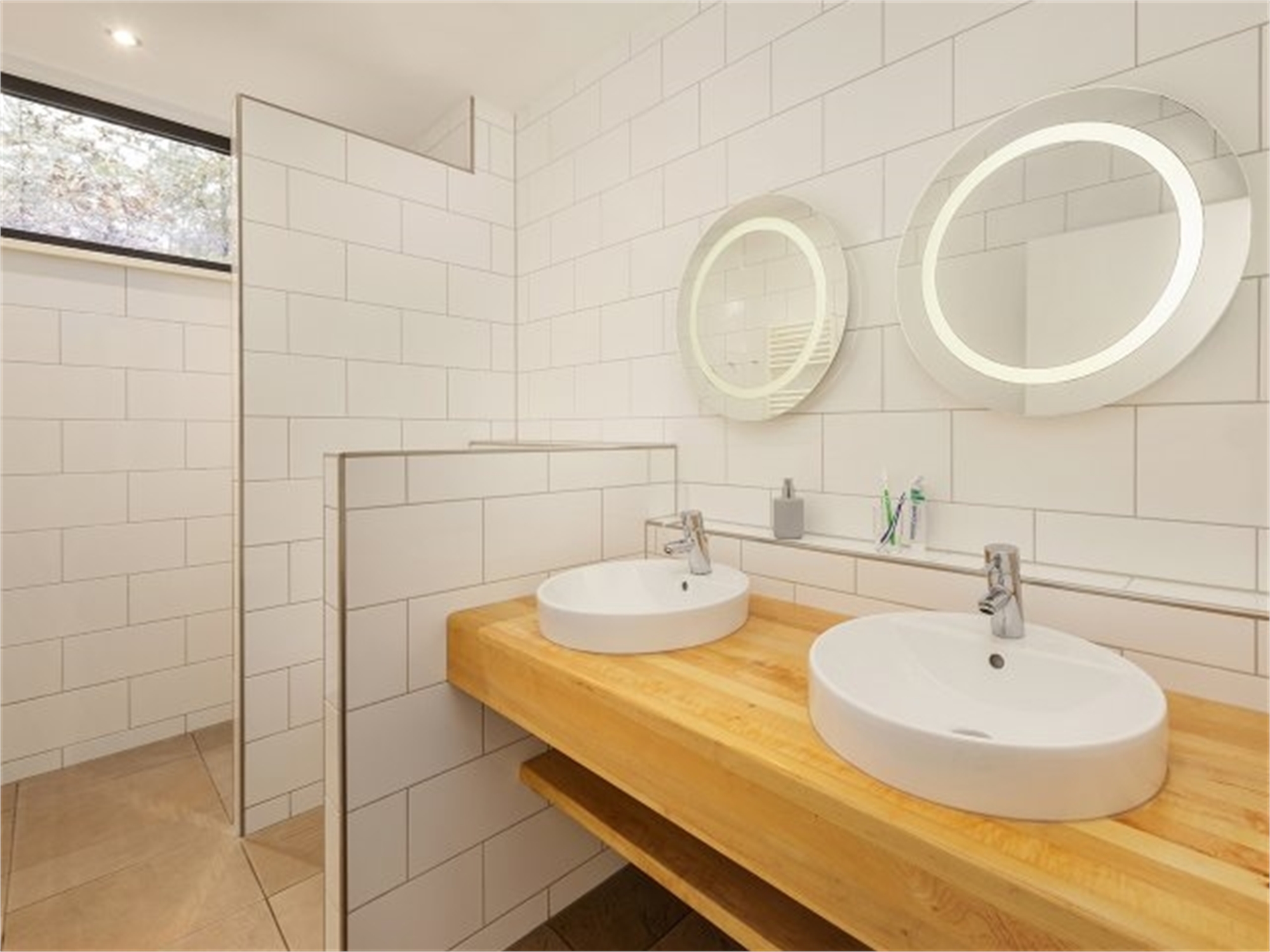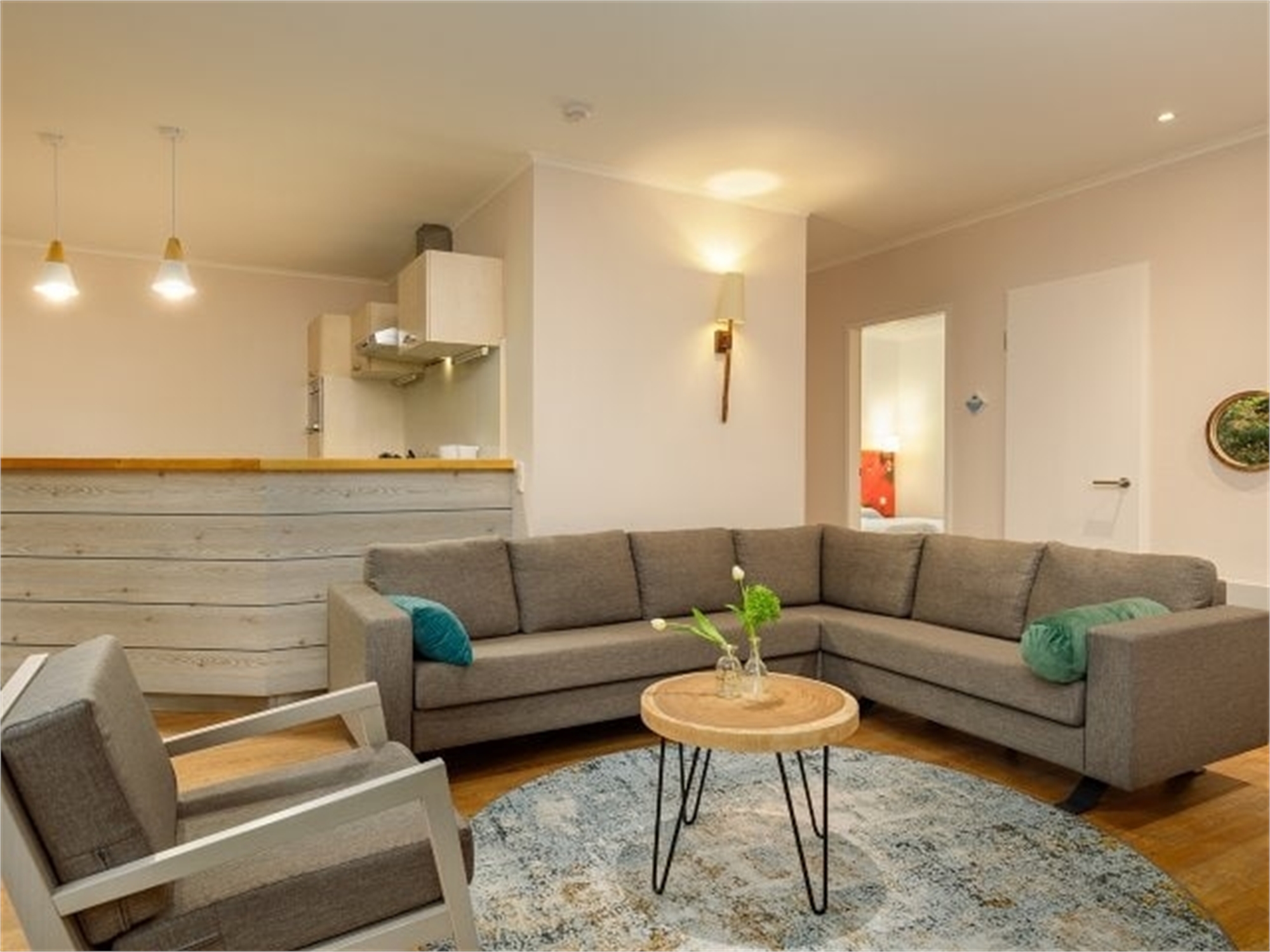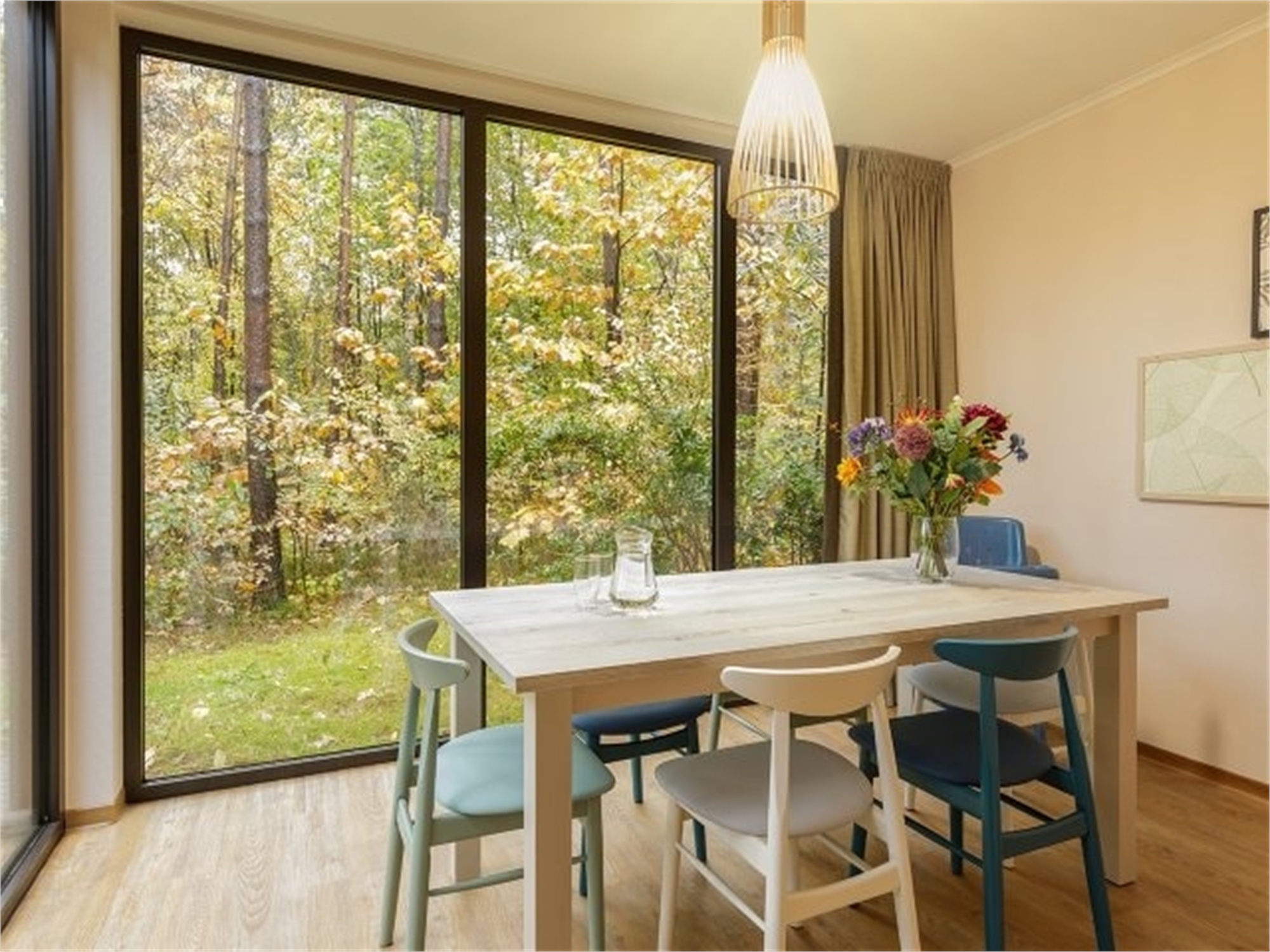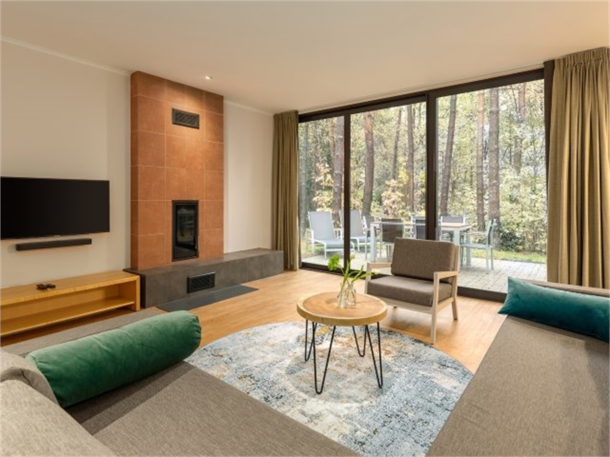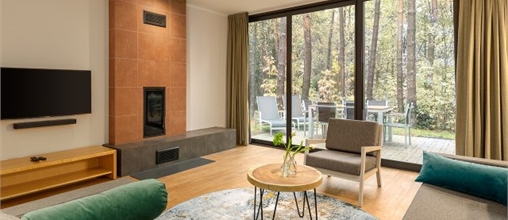 Durch die große Schiebetür wird Ihr Eden-Ferienhaus mit Sonnenlicht durchflutet. Öffne die Tür - und dein Wohnzimmer verschmilzt mit dem Garten. Ein Traum! Genieße den großzügigen Freiraum und den Komfort und entspanne am Kamin.