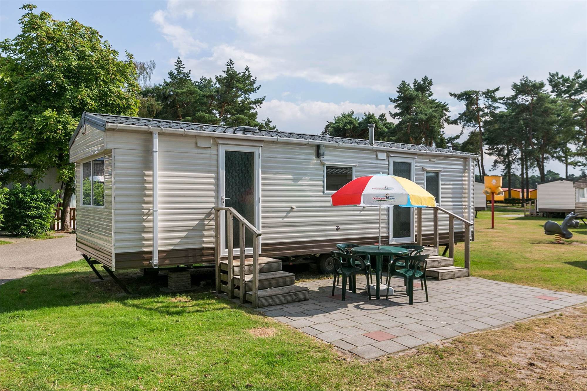 Ein Mobilheim ist ideal, um zu bleiben, wenn Sie während Ihres Urlaubs etwas mehr Luxus haben möchten. Genießen Sie das wunderbare Urlaubsgefühl, bei dem Sie nichts aufbauen oder mitnehmen müssen. Ihr Mobilheim ist immer mit einer möblierten Sitzecke mit TV und Herd, Küche mit Kühlschrank, Mikrowelle, Kaffeemaschine, 4-Flammen-Herd und Küchenausstattung, Bad mit WC, Waschbecken und Dusche und einem kompletten Gartenset inklusive Sonnenschirm "Oostappen Gruppe" ausgestattet. *Klassifizierung, Inventar und Ausstattung können je nach Ferienhaus variieren.