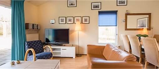 Diese Cottages für 6 Personen verfügen neben zwei Doppelzimmern mit Boxspringbetten noch über ein zusätzliches Schlafzimmer mit Etagenbett. Zur Einrichtung jedes Schlafzimmers gehören ein Waschbecken und ein Kleiderschrank. Die Sitzecke des rechteckigen Wohnzimmers ist mit zwei Sofas aus Kunstleder und einem Sessel eingerichtet. Der Einrichtungsstil entspricht demjenigen der Bornrif Cottages für 4 Personen.