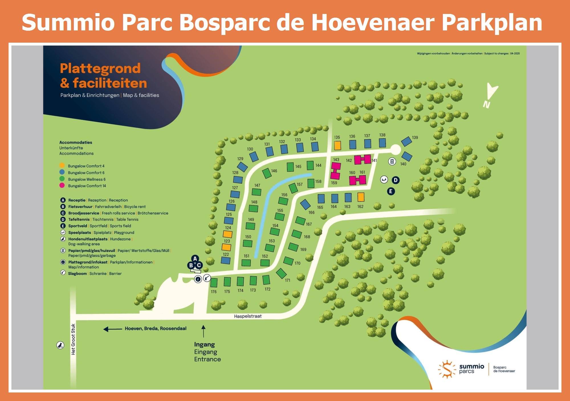 Aktueller und übersichtlicher Parkplan von Summio Parc Bosparc de Hoevenaer mit alle Unterkünfte und Einrichtungen, auch als PDF herunterladbar.