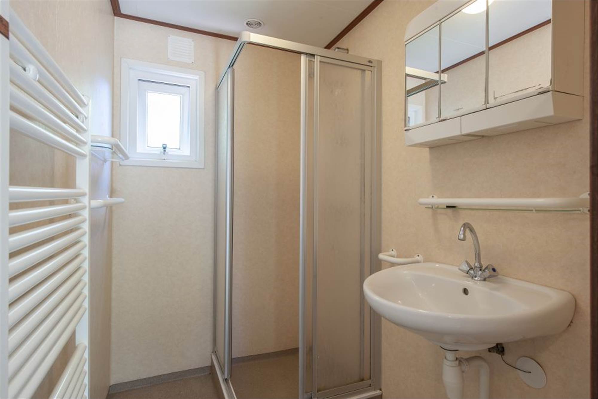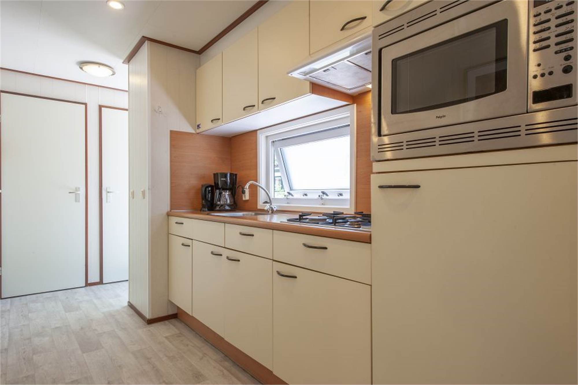 Dieses freistehende Chalet eignet sich für 4 Personen. Die Unterkunft verfügt über ein Wohnzimmer mit Essbereich und eine offene Küche mit Kombi-Mikrowelle. Es gibt 2 Schlafzimmer und ein Badezimmer mit Dusche und Waschtisch sowie eine separate Toilette. Durch die Flügeltüren im Wohnzimmer gelangen Sie auf die möblierte Terrasse.