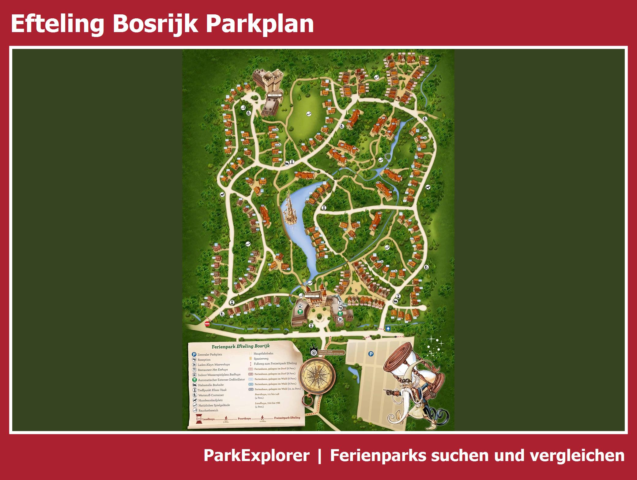 Aktueller und übersichtlicher Parkplan von Efteling Bosrijk mit alle Unterkünfte und Einrichtungen, auch als PDF herunterladbar.
