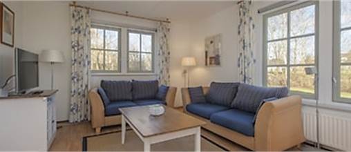 Erdgeschoss: Eingang mit Flur und Toilette. Wohnzimmer mit Sitz- und Essecke, offene Küche und aufschlagende Türen zur Terrasse mit Gartenmöbeln. Ein Schlafzimmer mit zwei Einzelbetten. Badezimmer mit Waschtisch, Dusche und Badewanne.