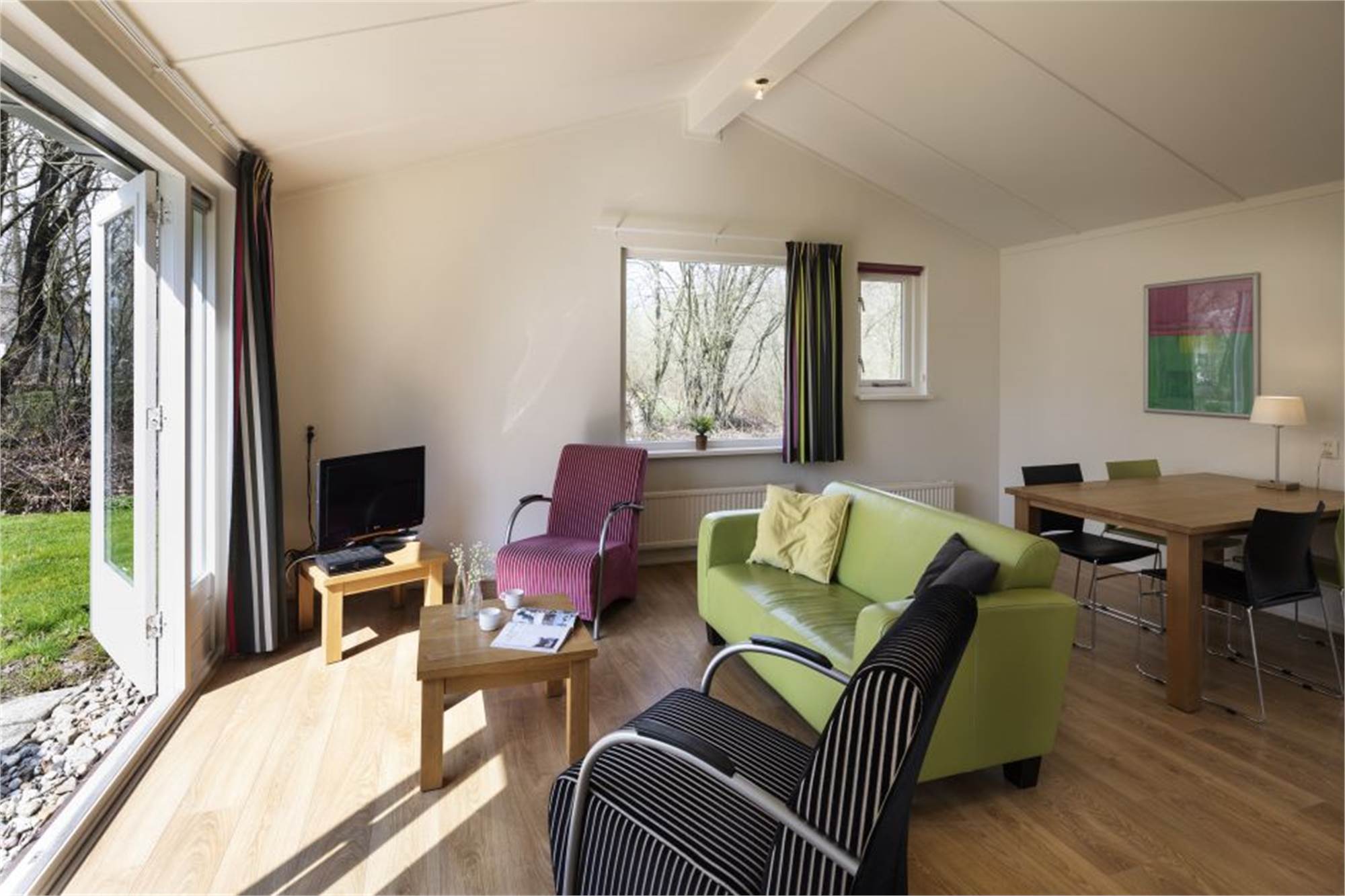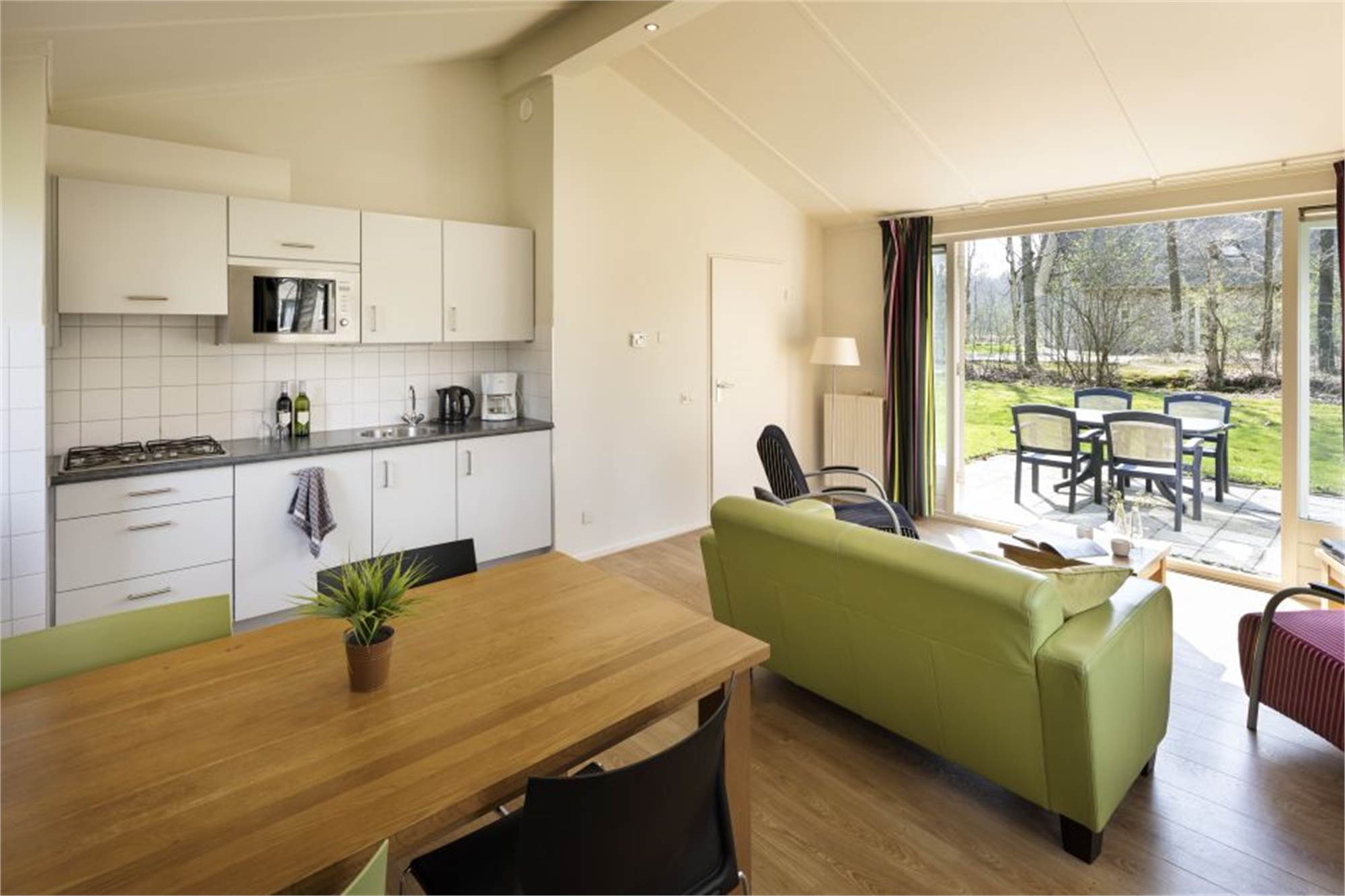 Diese freistehende Bungalow eignet sich für 4 Personen. Es gibt ein gemütliches Wohnzimmer und eine Küche mit Geschirrspüler, Mikrowelle mit Grillfunktion, Kühlschrank mit Gefrierfach und Kaffeemaschine. Darüber hinaus finden Sie 2 Schlafzimmer mit je 2 Einzel-Boxspringbetten, ein Badezimmer mit Dusche und eine separate Toilette. Im Außenbereich befinden sich eine möblierte Terrasse sowie eine Parkmöglichkeit in der Nähe der Unterkunft. Die Nutzung von WiFi ist gratis.