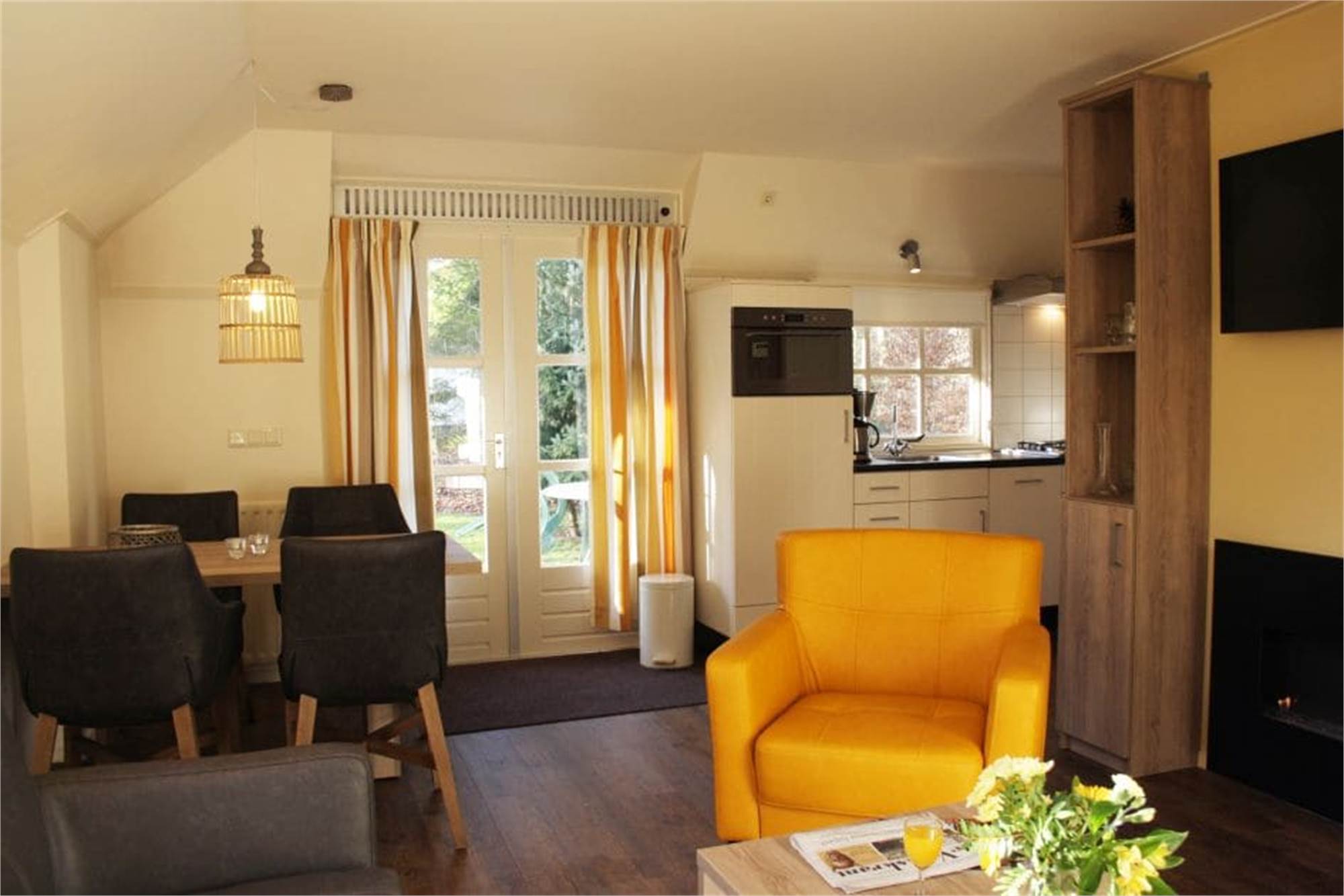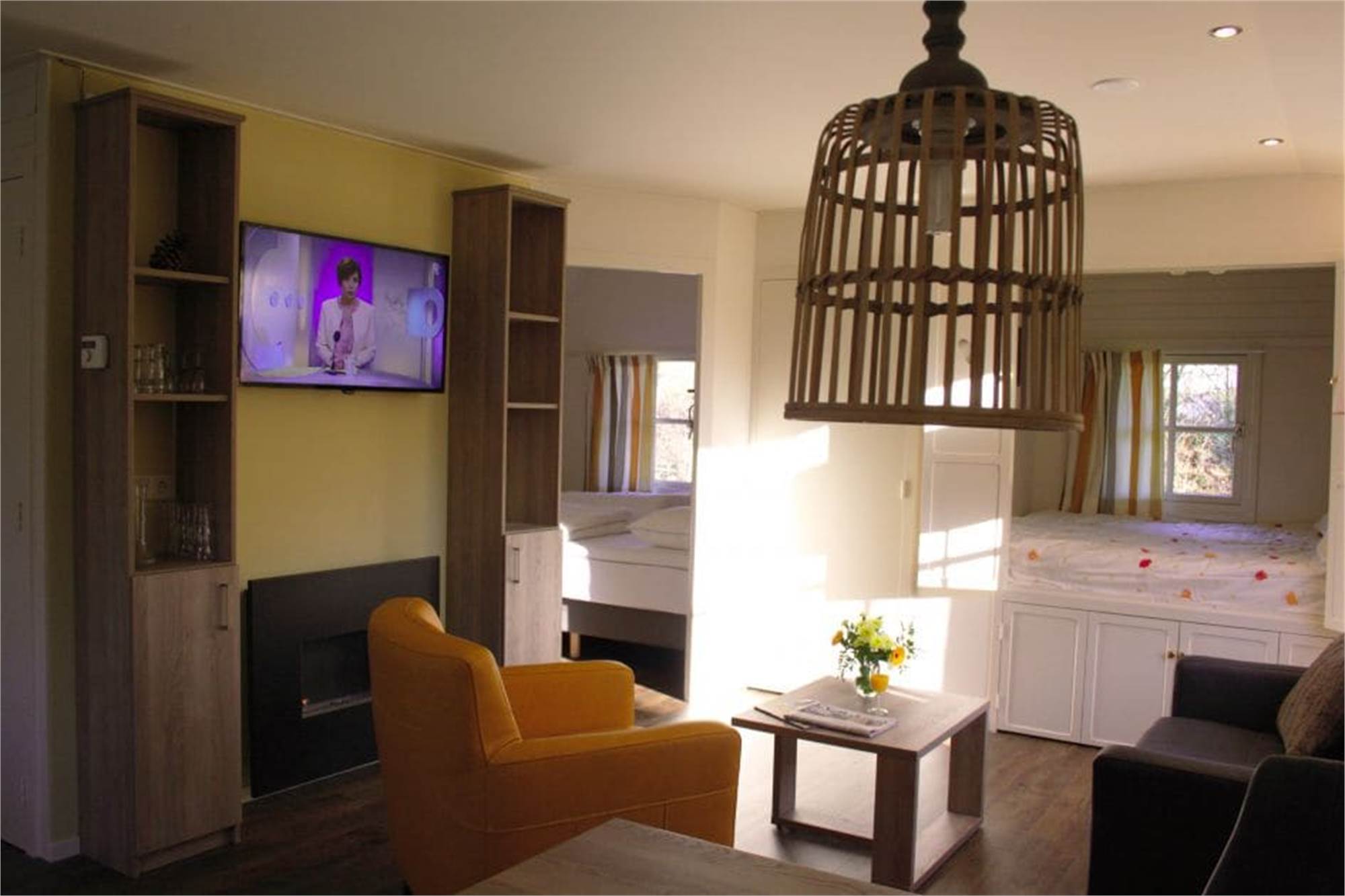 Einteilung: Wohn-/Schlafzimmer mit Flatscreen-TV und Alkoven. Küche mit Kühlschrank mit Gefrierfach, Geschirrspüler, Backofen, Mikrowelle und Kaffeemaschine. Badezimmer mit Fußbodenheizung und Toilette. Schlafzimmer mit zwei Einzelbetten und ein Schrankbett. Ladestation für Elektro-Fahrräder. Lage am Waldrand.