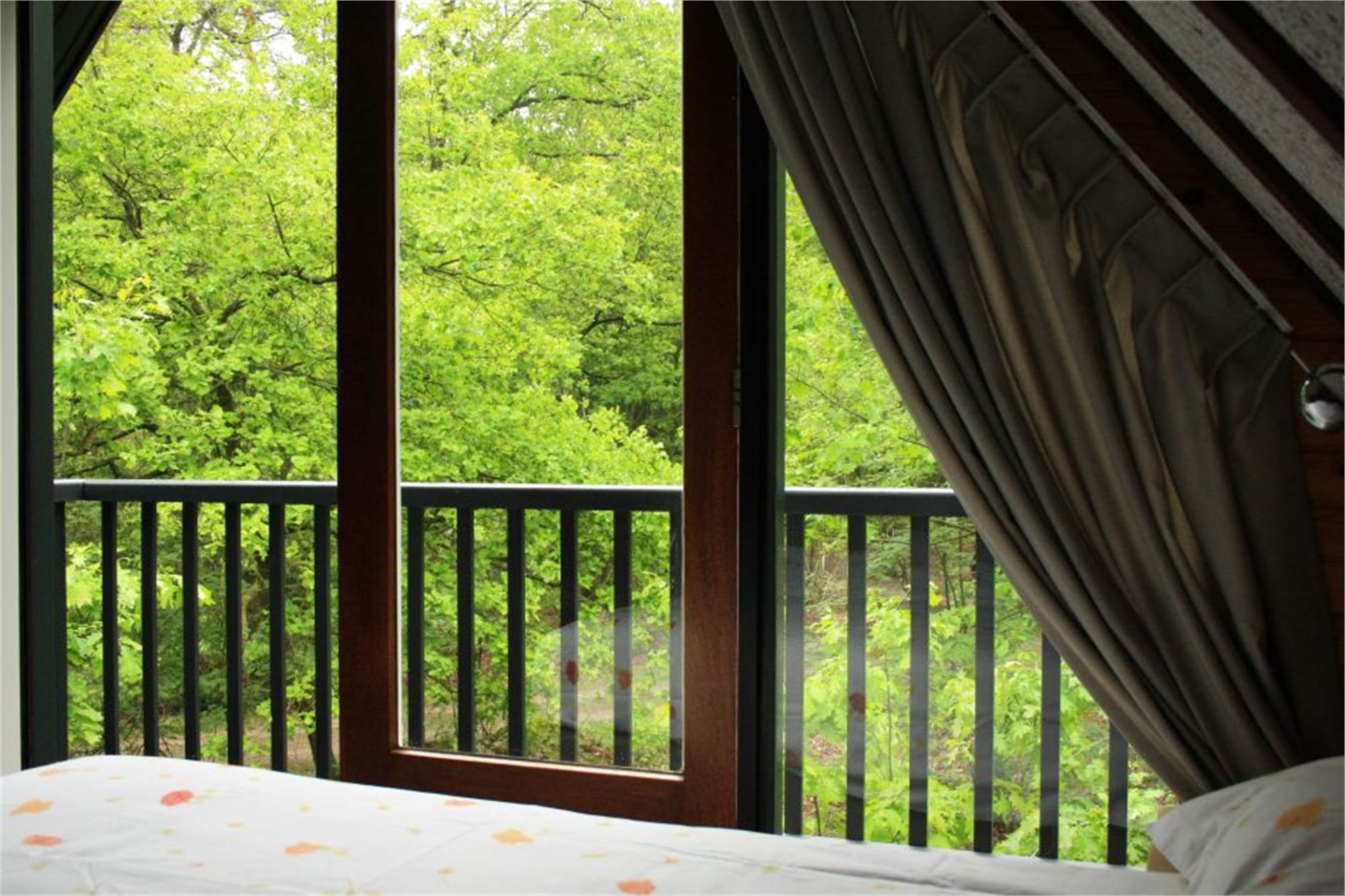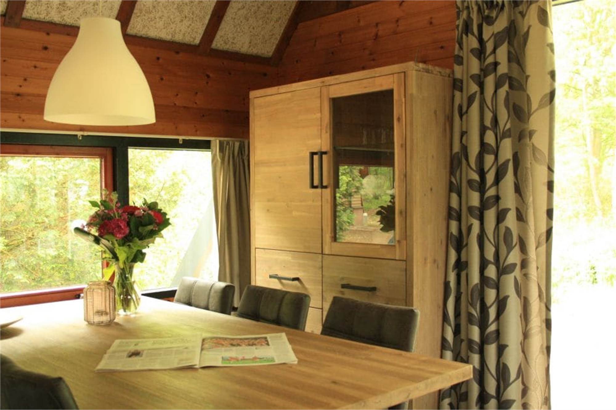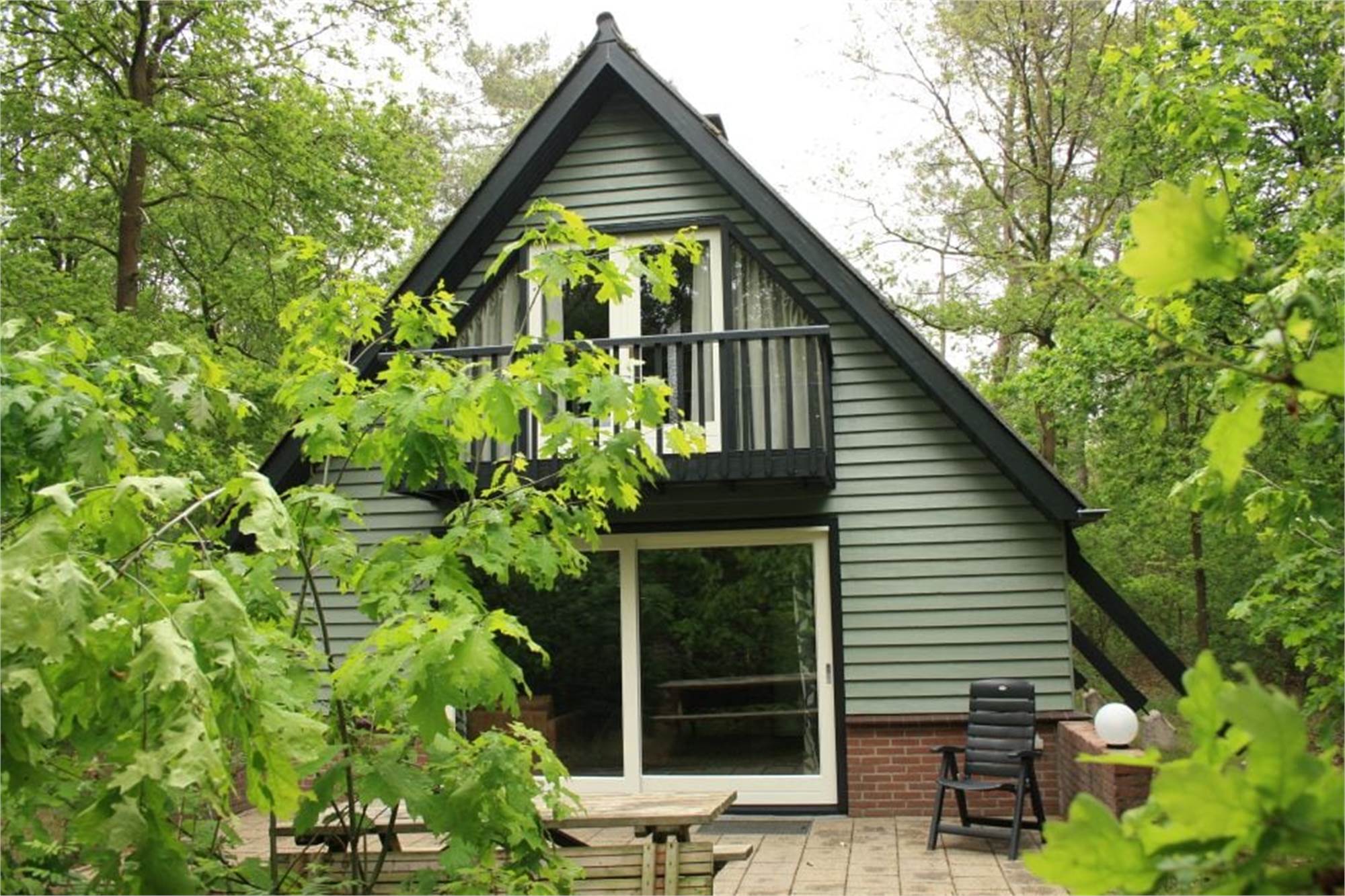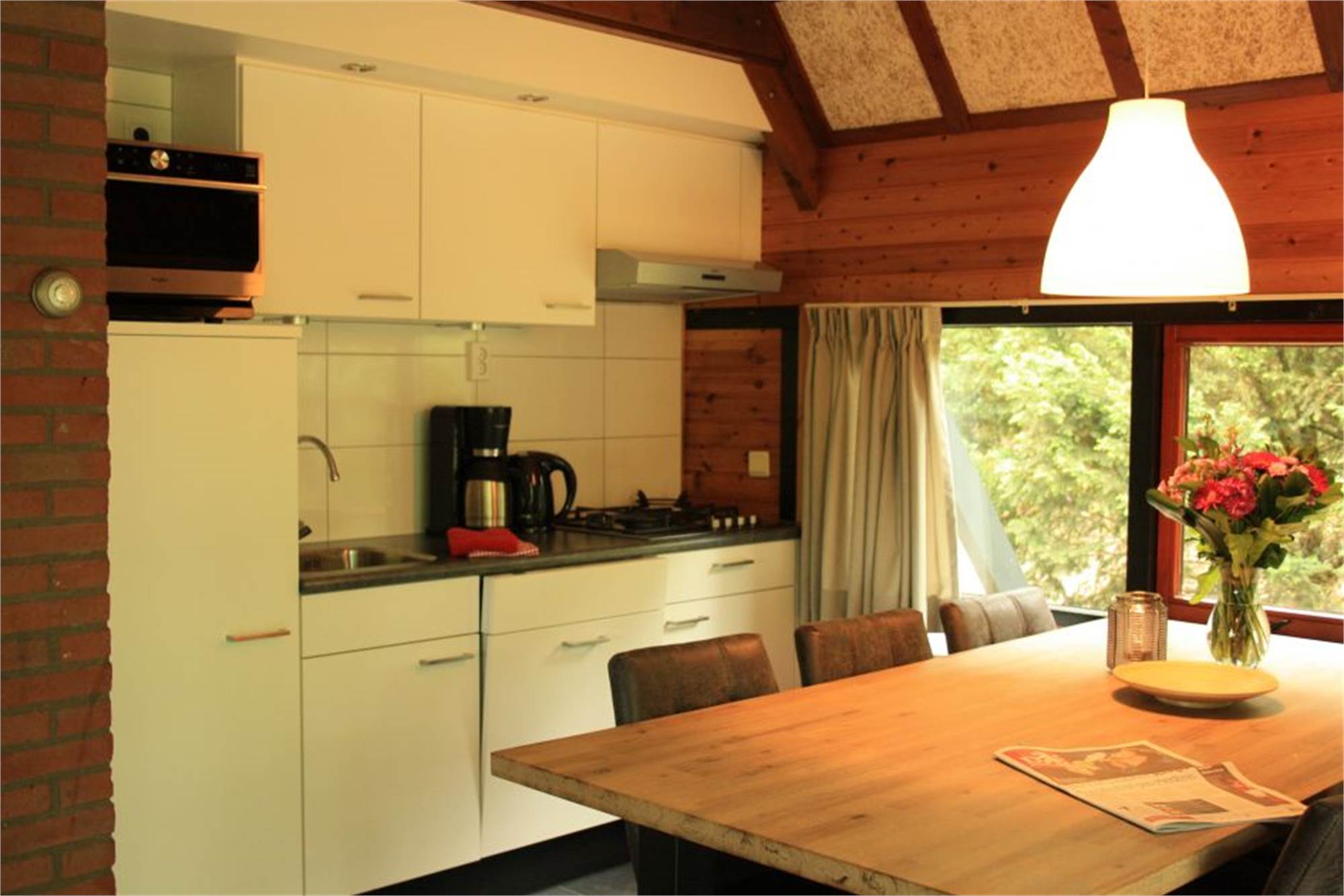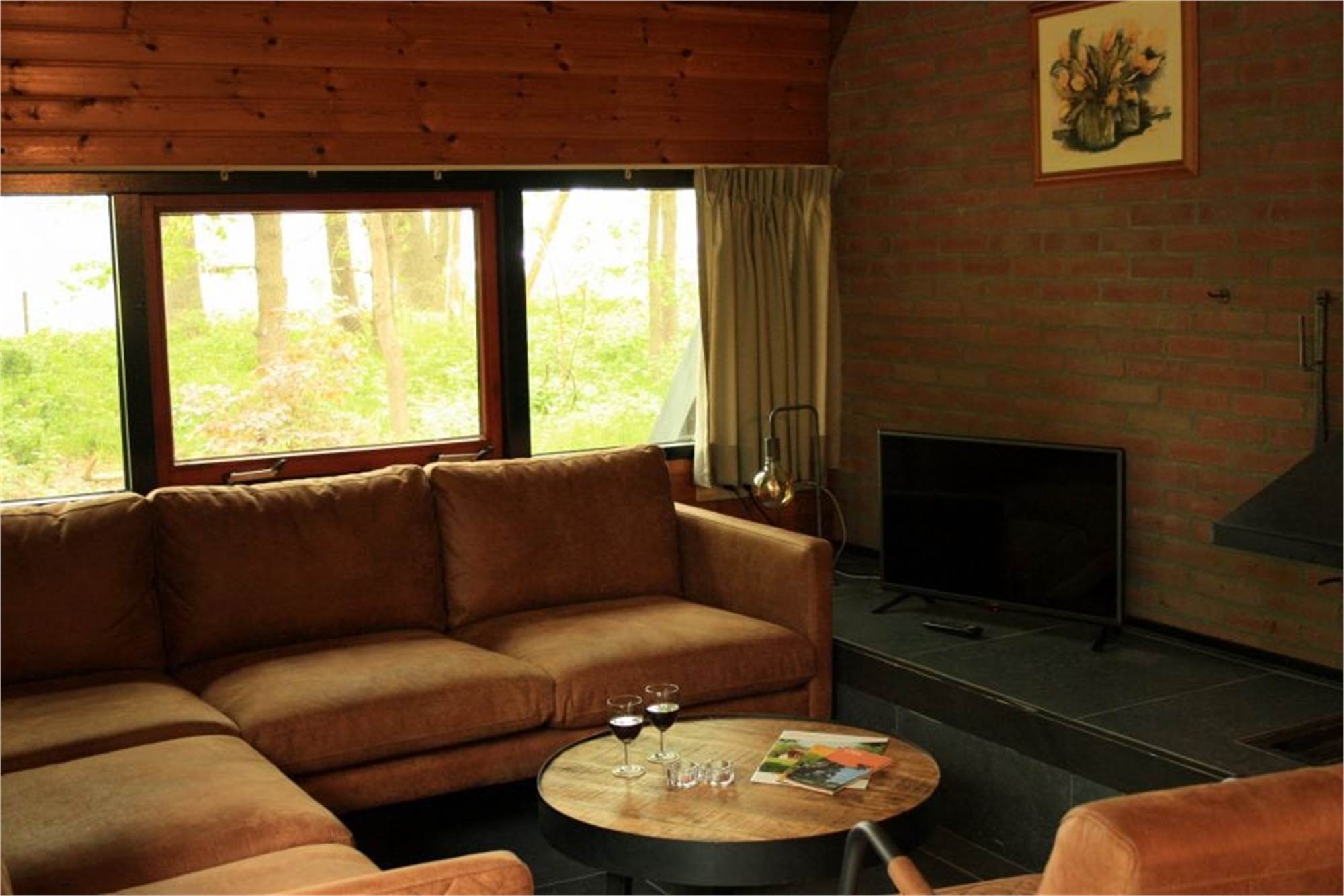 Einteilung: Wohnzimmer mit Fußbodenheizung, offenem Kamin und Flatscreen-TV. Küche mit Kühlschrank mit Gefrierfach, Kaffeemaschine und Mikrowelle. Schlafzimmer mit zwei Einzelbetten. Badezimmer mit Fußbodenheizung, Dusche und Toilette. Ladestation für Elektro-Fahrräder. Terrasse mit offenem Kamin und Lage am Waldrand.