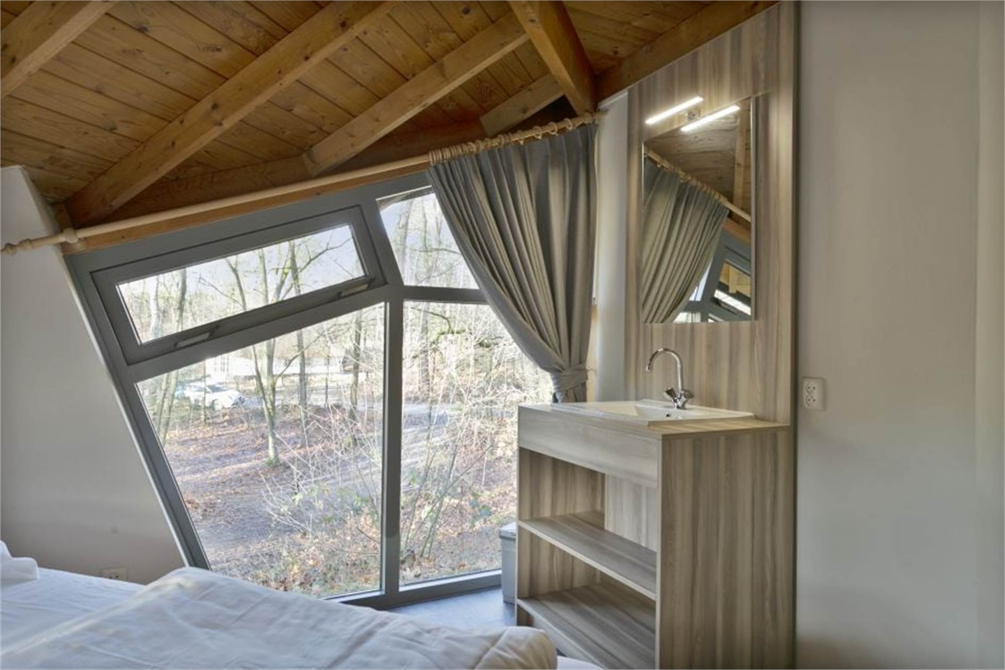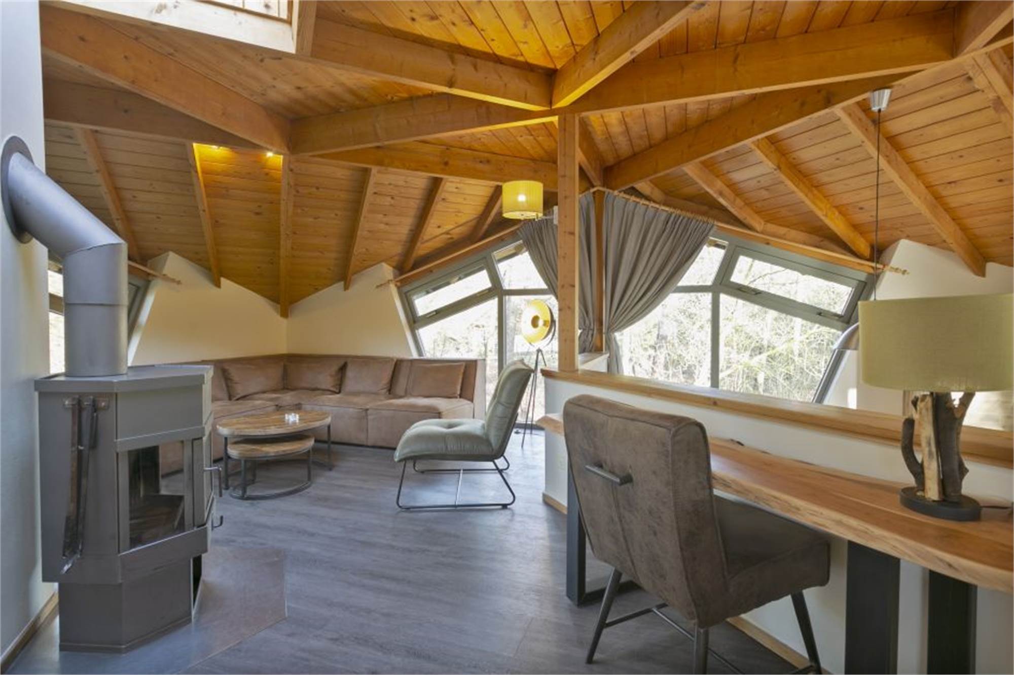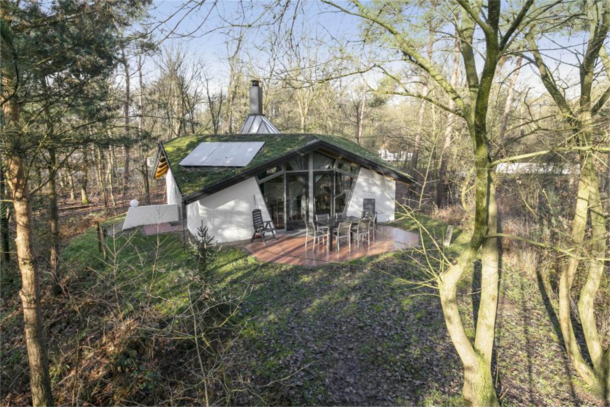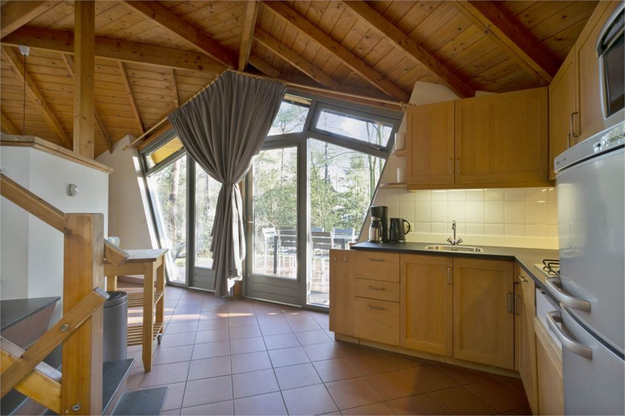 Einteilung: Wohnzimmer mit Fußbodenheizung und Flatscreen-TV. Küche mit Kühlschrank mit Gefrierfach, Geschirrspüler, Kaffeemaschine, Backofen und Kombi-Mikrowelle. Badezimmer mit Fußbodenheizung, begehbarer Dusche und Badewanne. Separate Toilette. Ladestation für Elektro-Fahrräder. Terrasse und Lage am Waldrand.