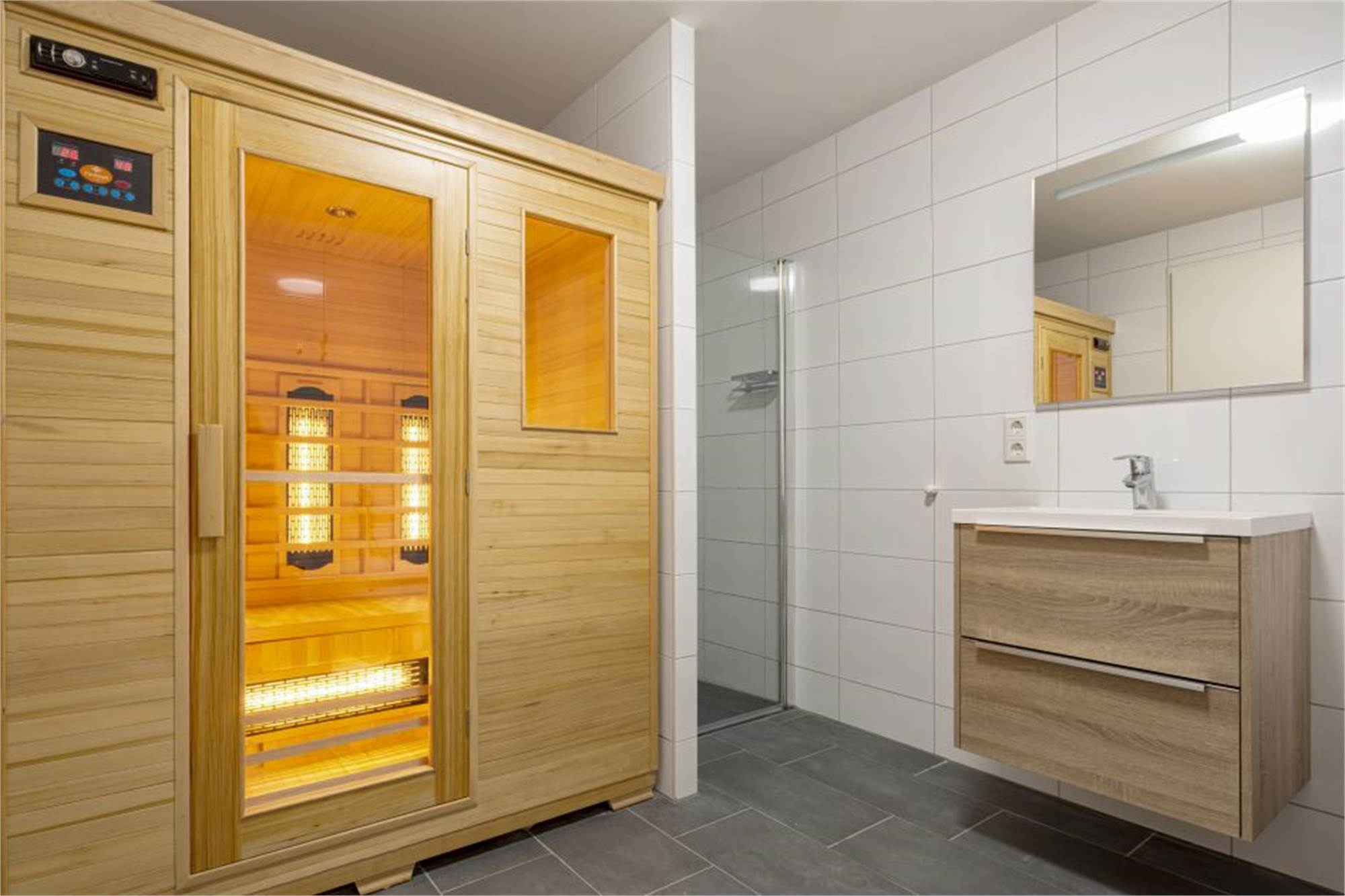 Dieser ebenerdige Bungalow ist für 8 Personen geeignet. Im Wohnzimmer befinden sich eine Sitzecke mit Fernseher und ein elektrischer Kamin. Die Küche ist unter anderem mit einem Kühlschrank mit Gefrierfach und einer Kombi-Mikrowelle ausgestattet. Es gibt 4 Schlafzimmer mit jeweils 2 Einzelbetten. In 3 Schlafzimmern befindet sich ein Fernseher. Es gibt 2 Badezimmer mit bodentiefer Dusche. Es gibt 1 separate Toilette und 1 weitere Toilette in einem der Badezimmer. Der Bungalow verfügt über eine Infrarot-Sauna. Im Außenbereich gibt es eine Terrasse mit Gartenmöbeln. Fahrzeuge können auf dem zentralen Parkplatz abgestellt werden.