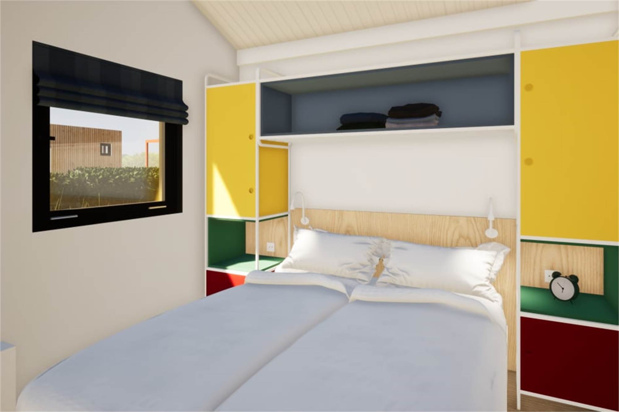 Diese freistehende Lodge ist für 4 Personen geeignet. Im Wohnzimmer befindet sich eine Sitzecke, eine Essecke und ein Smart-TV. Die Küche ist mit einem Geschirrspüler, Kühlschrank mit Gefrierfach, einer Mikrowelle, Kaffeemaschine und Wasserkocher ausgestattet. Es sind 2 Schlafzimmer mit jeweils 2 Einzelbetten vorhanden. Das Badezimmer verfügt über eine Waschbecken und eine begehbare Dusche. Es ist ein separates WC vorhanden. Die Lodge verfügt über einen Garten mit einer Veranda und einem Loungeset. Die gesamte Lodge ist mit Fußbodenheizung versehen und verfügt über kostenloses WiFi.