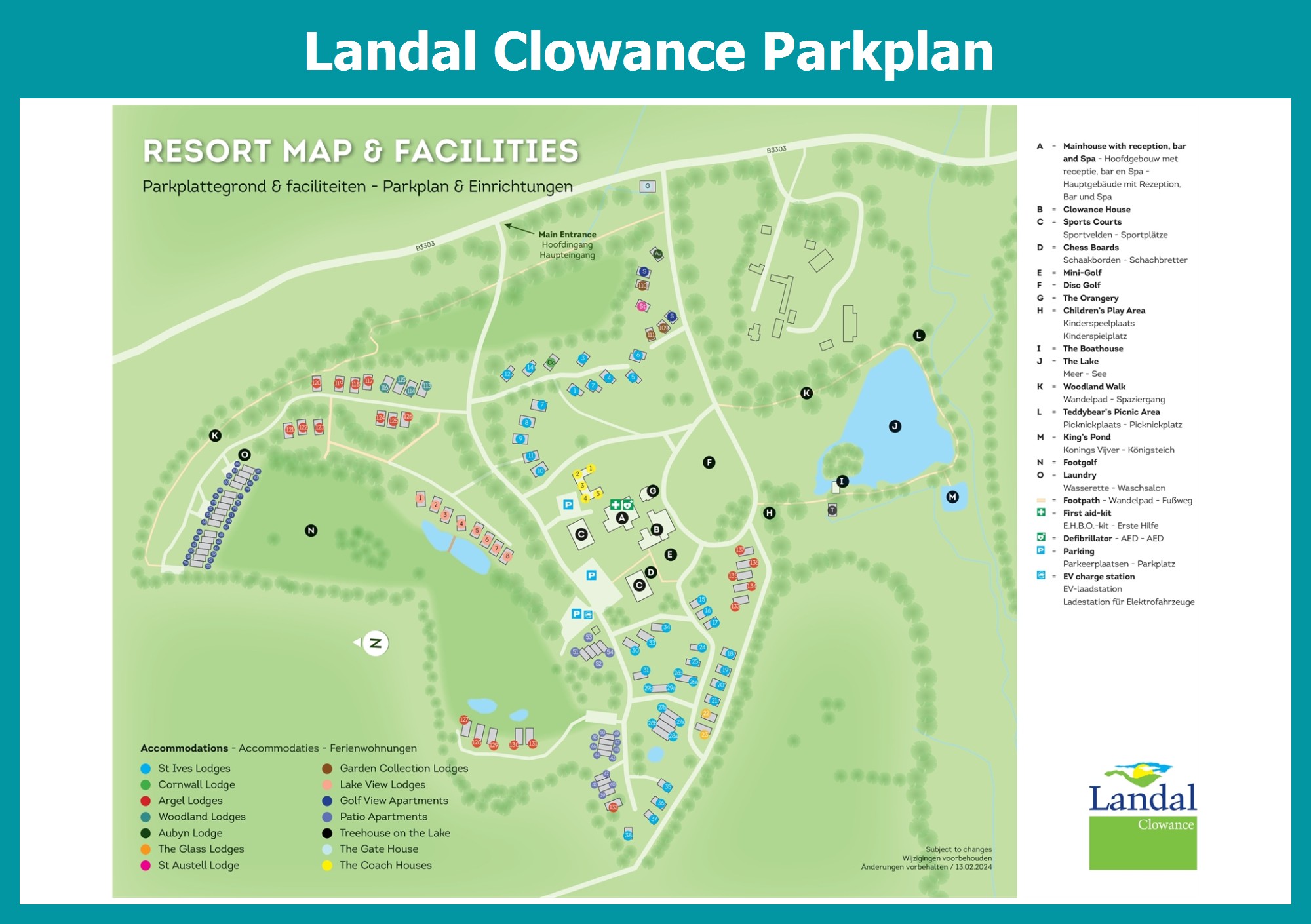 Aktueller und übersichtlicher Parkplan von Landal Clowance mit alle Unterkünfte und Einrichtungen, auch als PDF herunterladbar.