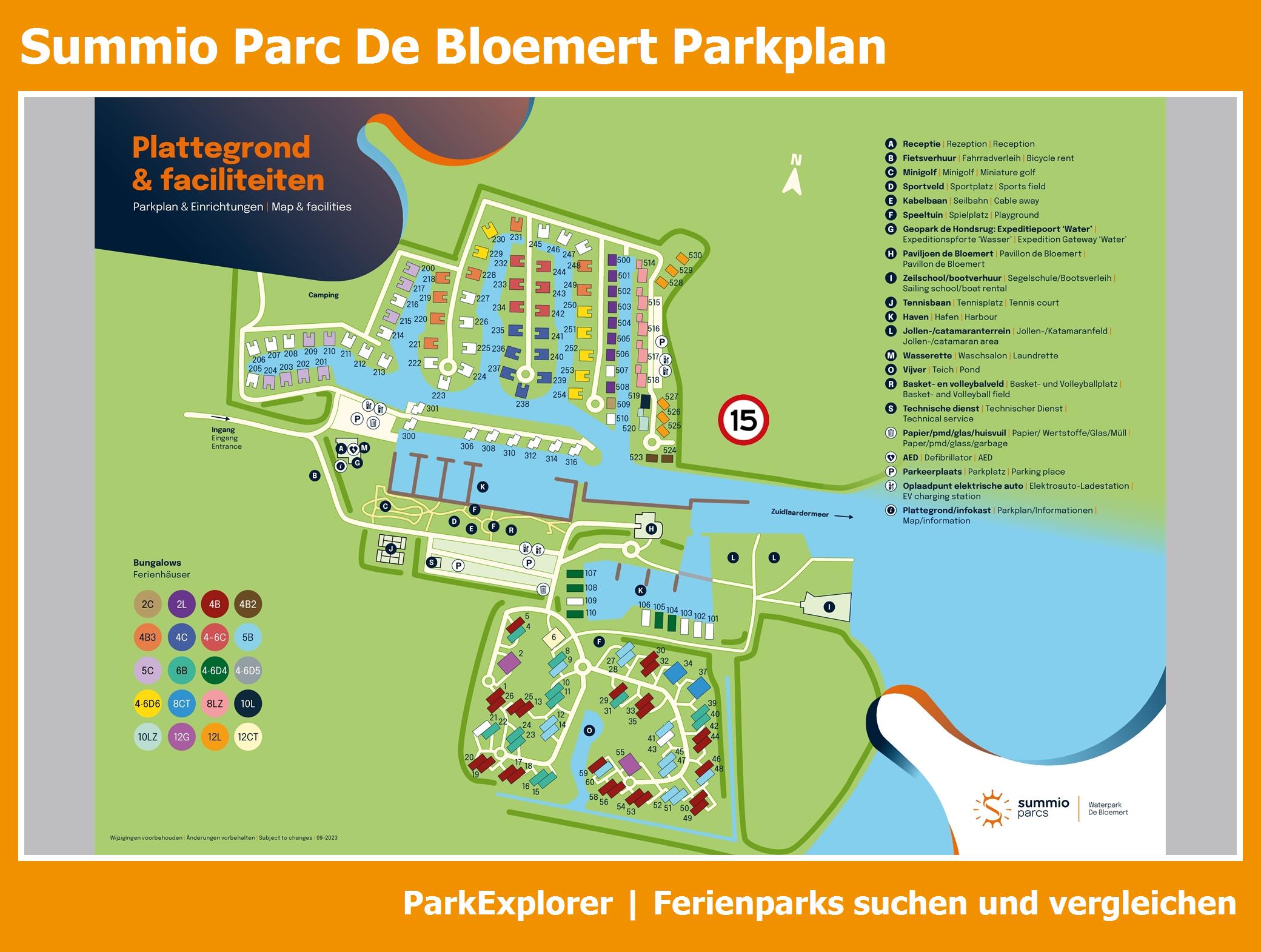 Aktueller und übersichtlicher Parkplan von Summio Parc De Bloemert mit alle Unterkünfte und Einrichtungen, auch als PDF herunterladbar.