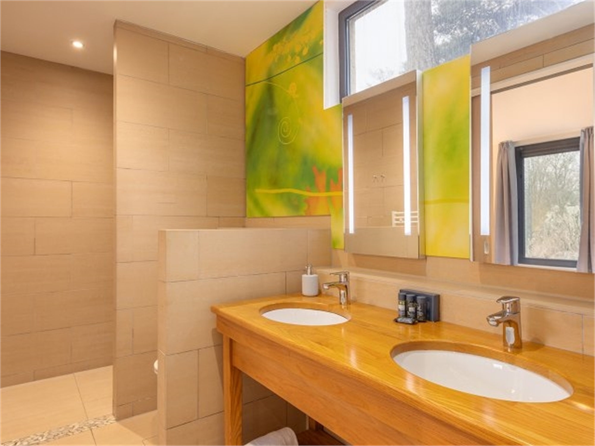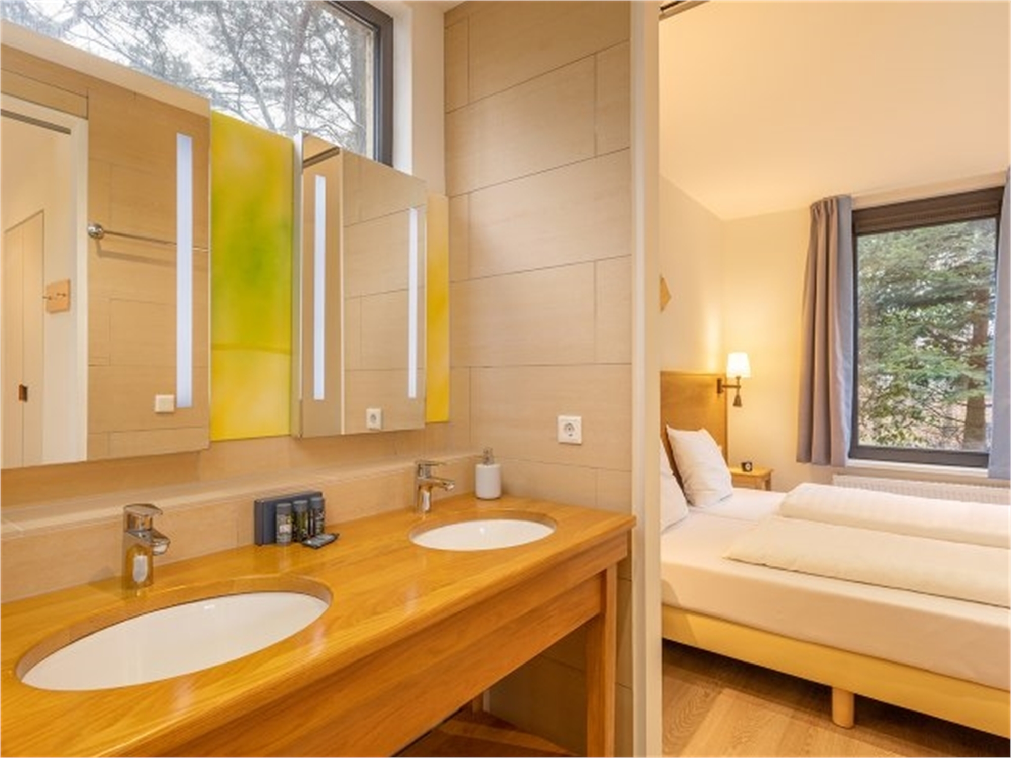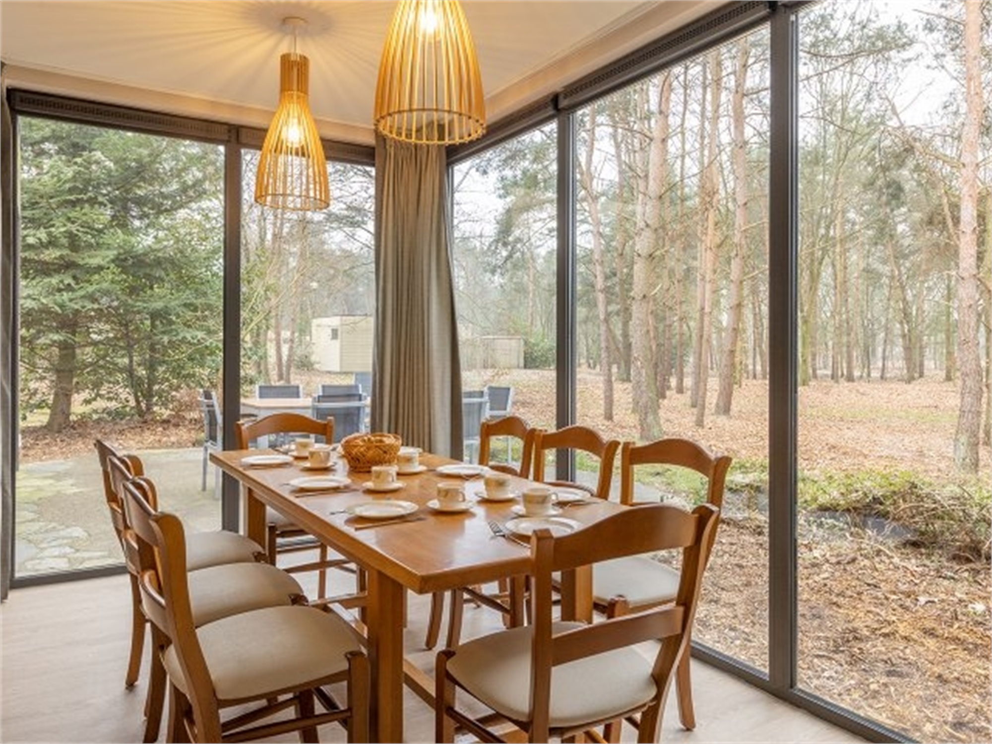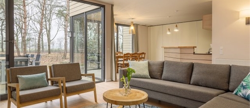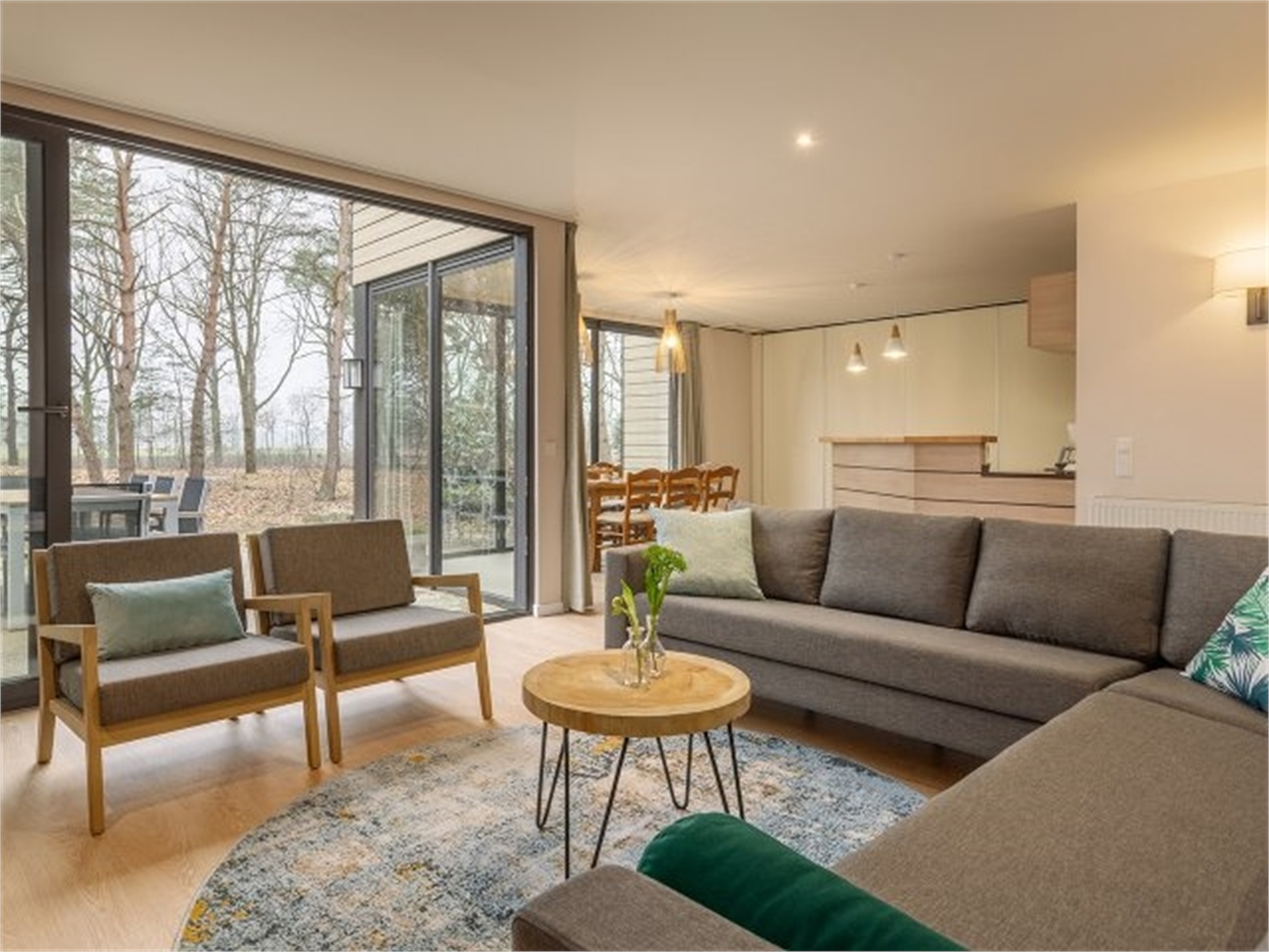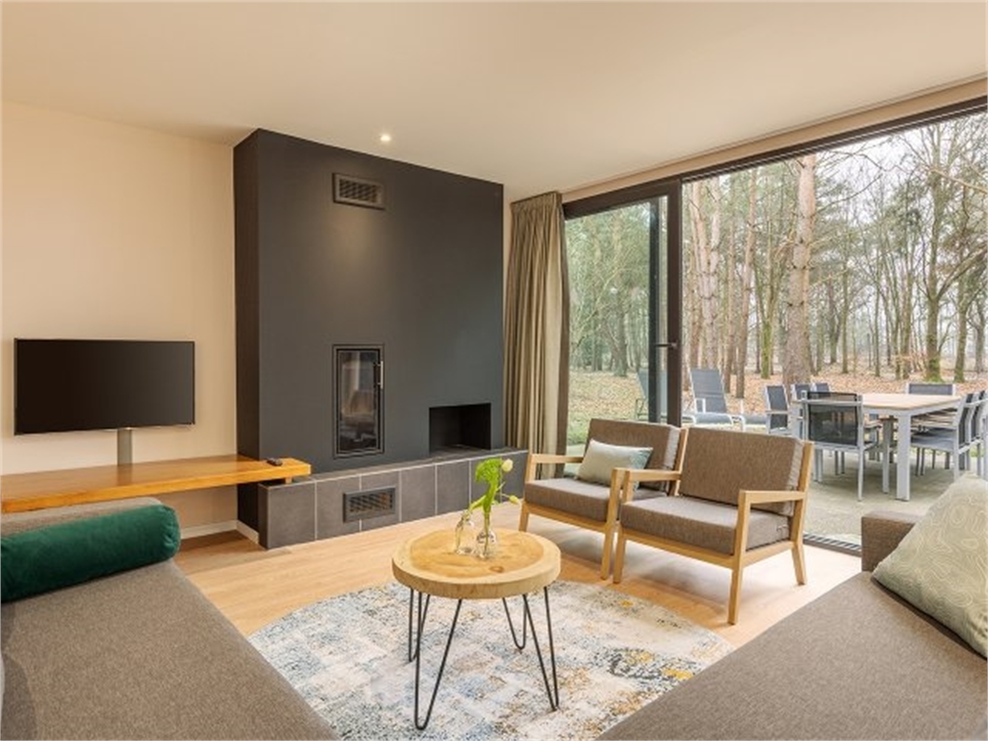 Durch die große Schiebetür wird Ihr Eden-Ferienhaus mit Sonnenlicht durchflutet. Öffne die Tür - und dein Wohnzimmer verschmilzt mit dem Garten. Ein Traum! Genieße den großzügigen Freiraum und den Komfort und entspanne am Kamin.