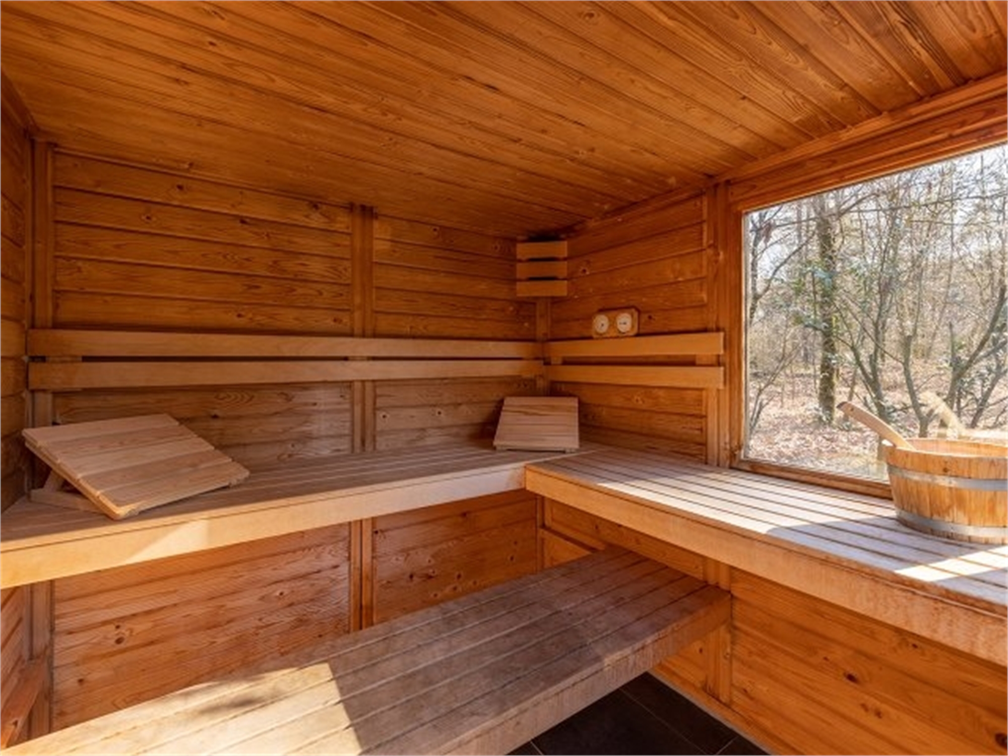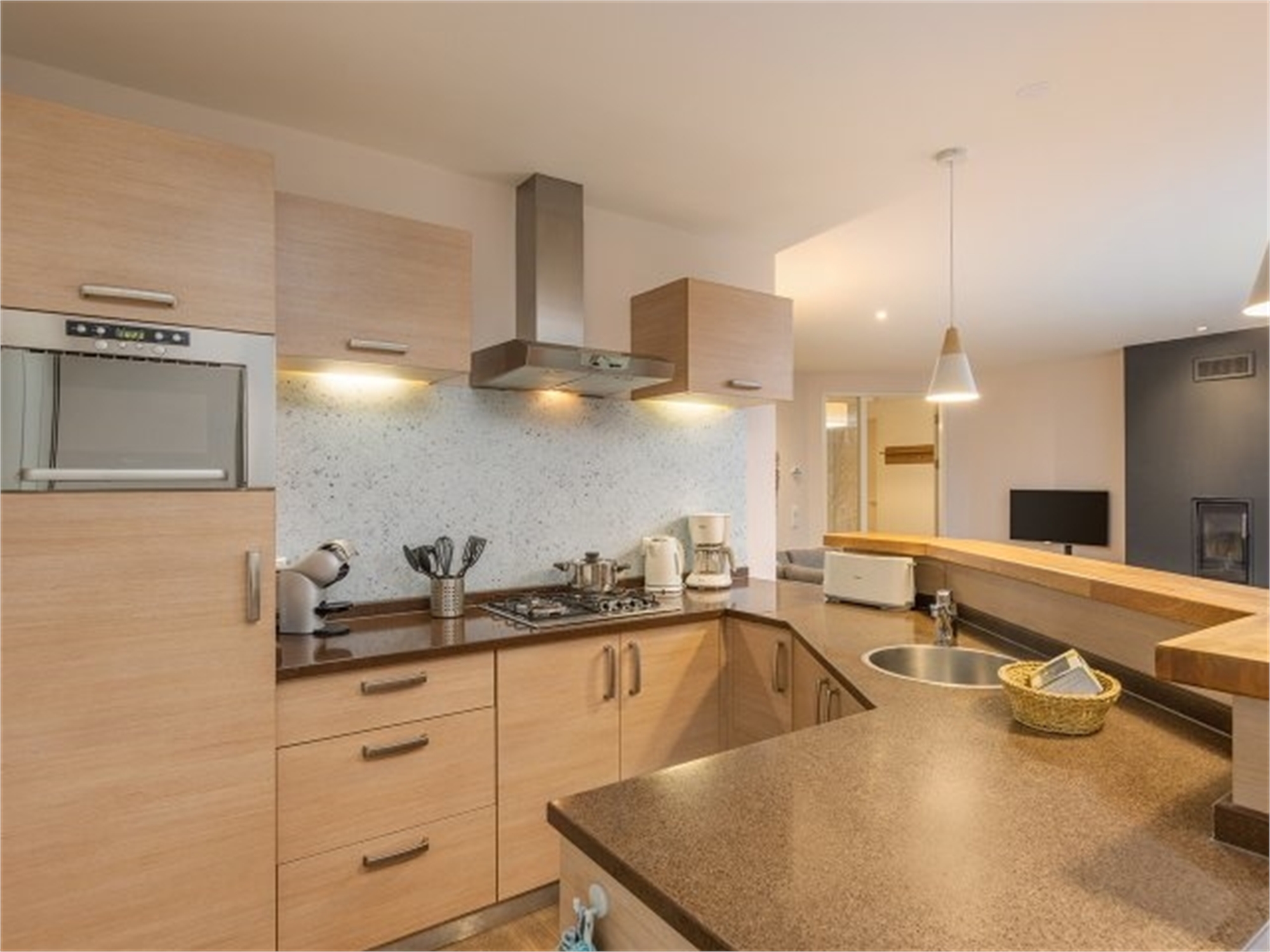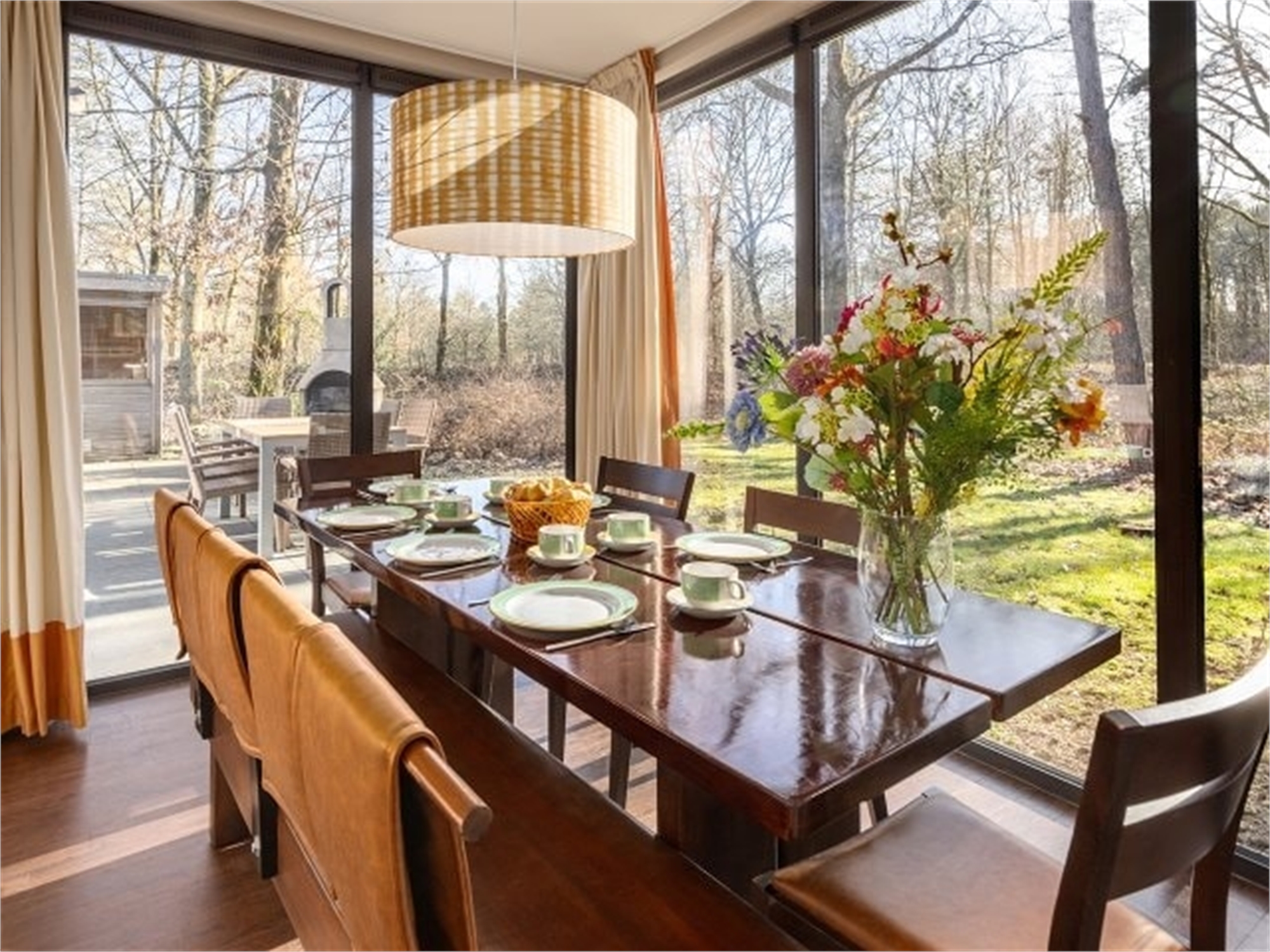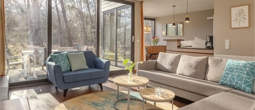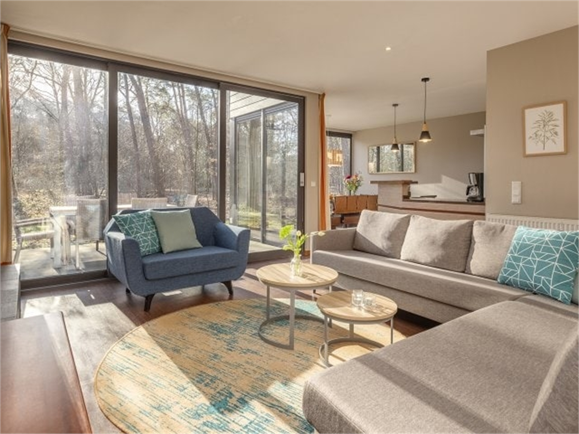 Durch die große Schiebetür wird Ihr Eden-Ferienhaus mit Sonnenlicht durchflutet. Öffnen Sie die Tür - und ihr Wohnzimmer verschmilzt mit dem Garten. Ein Traum! Genießen Sie den großzügigen Freiraum und den Komfort. Entspannen Sie am Kamin und werfen Sie den Grill an - für einen langen Sommerabend.