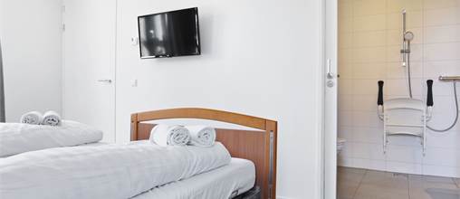 - Angepasstes Schlafzimmer mit einem Boxspring-Einzelbet und einem Hoch-/Tiefbett, Softtopper, Rollstuhlwendekreise von mind. 150 cm und Flatscreen-TV