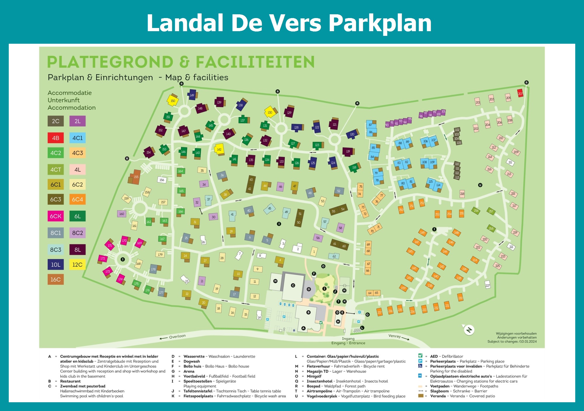 Aktueller und übersichtlicher Parkplan von Landal De Vers mit alle Unterkünfte und Einrichtungen, auch als PDF herunterladbar.