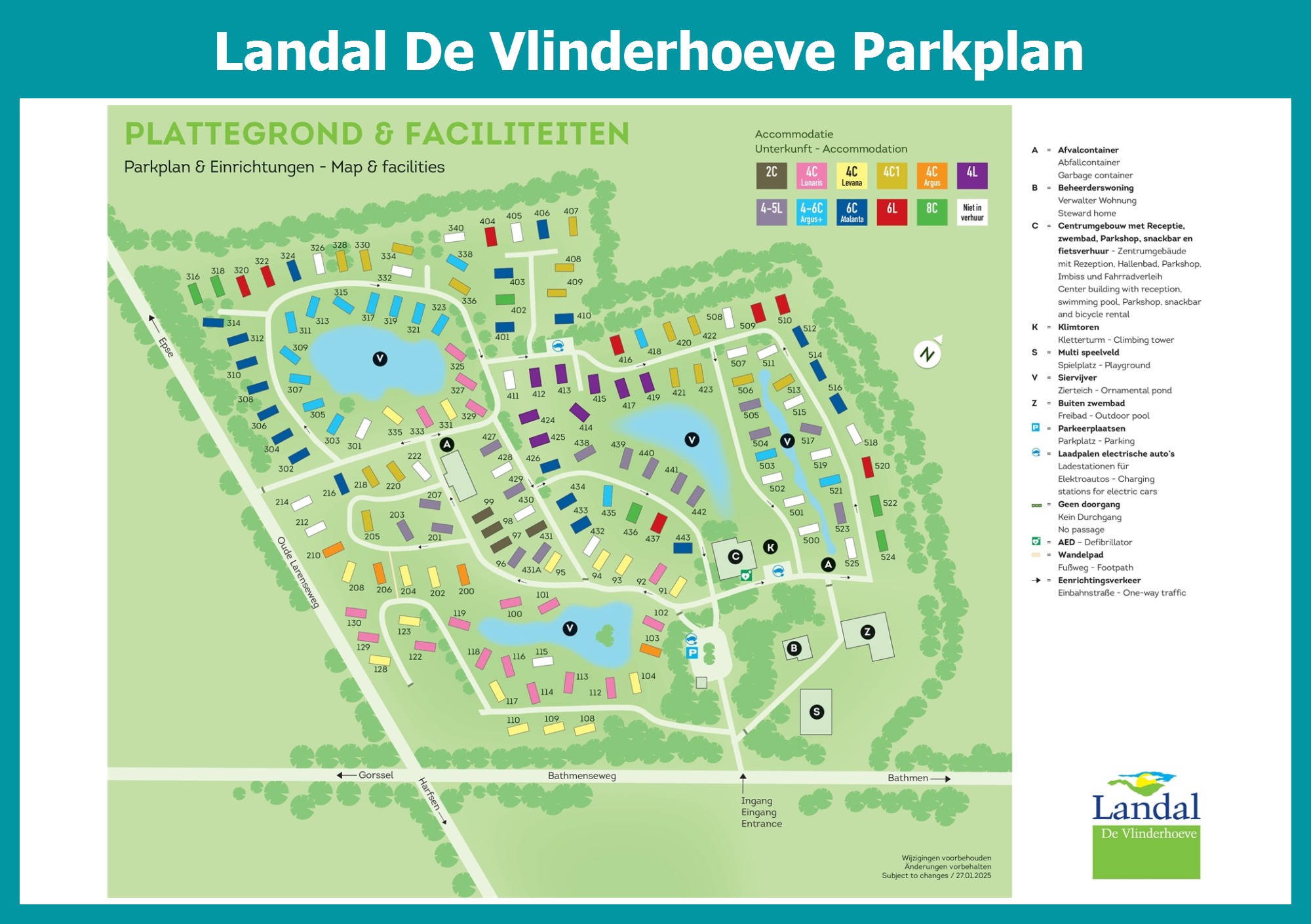Aktueller und übersichtlicher Parkplan von Landal De Vlinderhoeve mit alle Unterkünfte und Einrichtungen, auch als PDF herunterladbar.