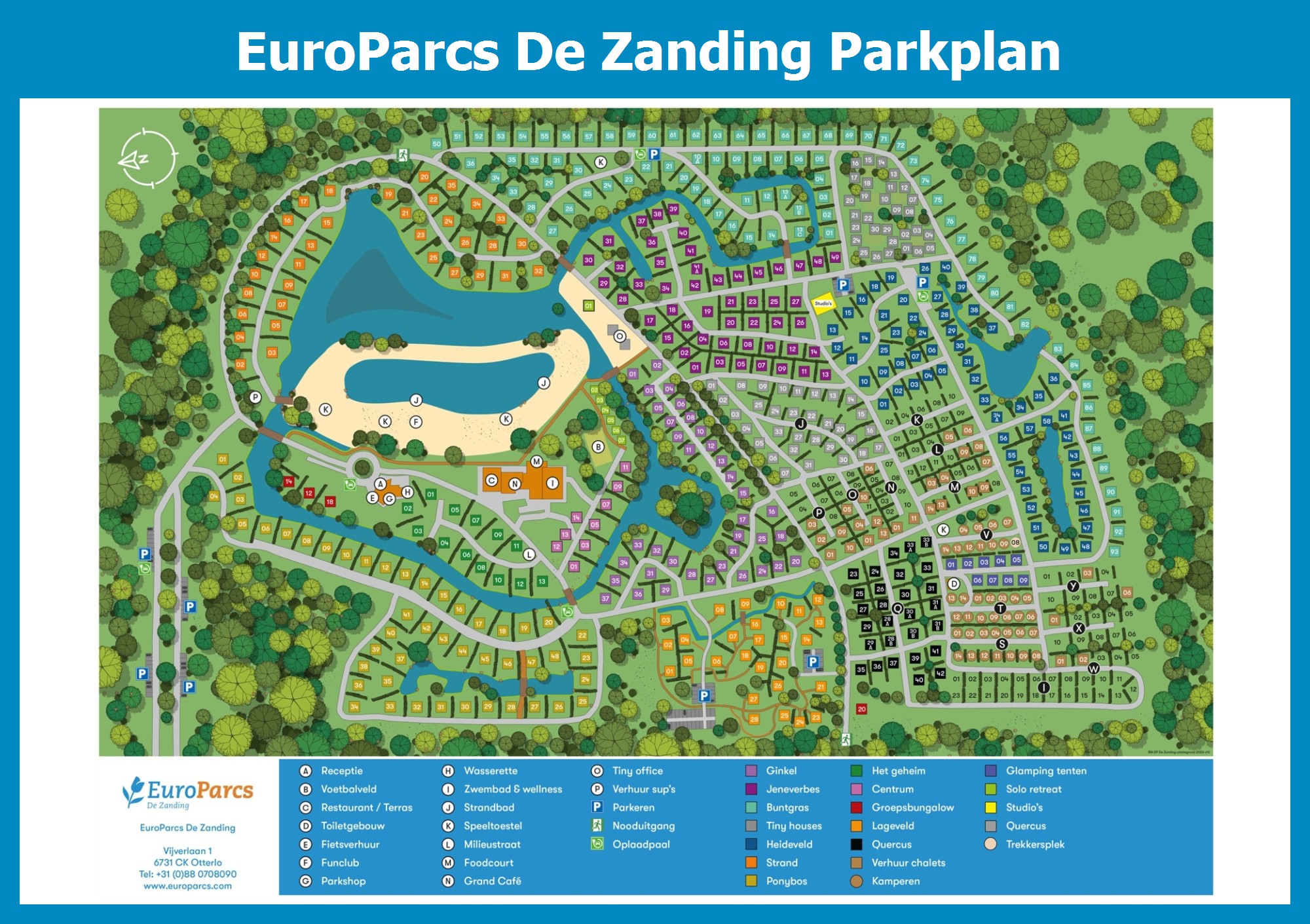 Aktueller und übersichtlicher Parkplan von EuroParcs De Zanding mit alle Unterkünfte und Einrichtungen, auch als PDF herunterladbar.