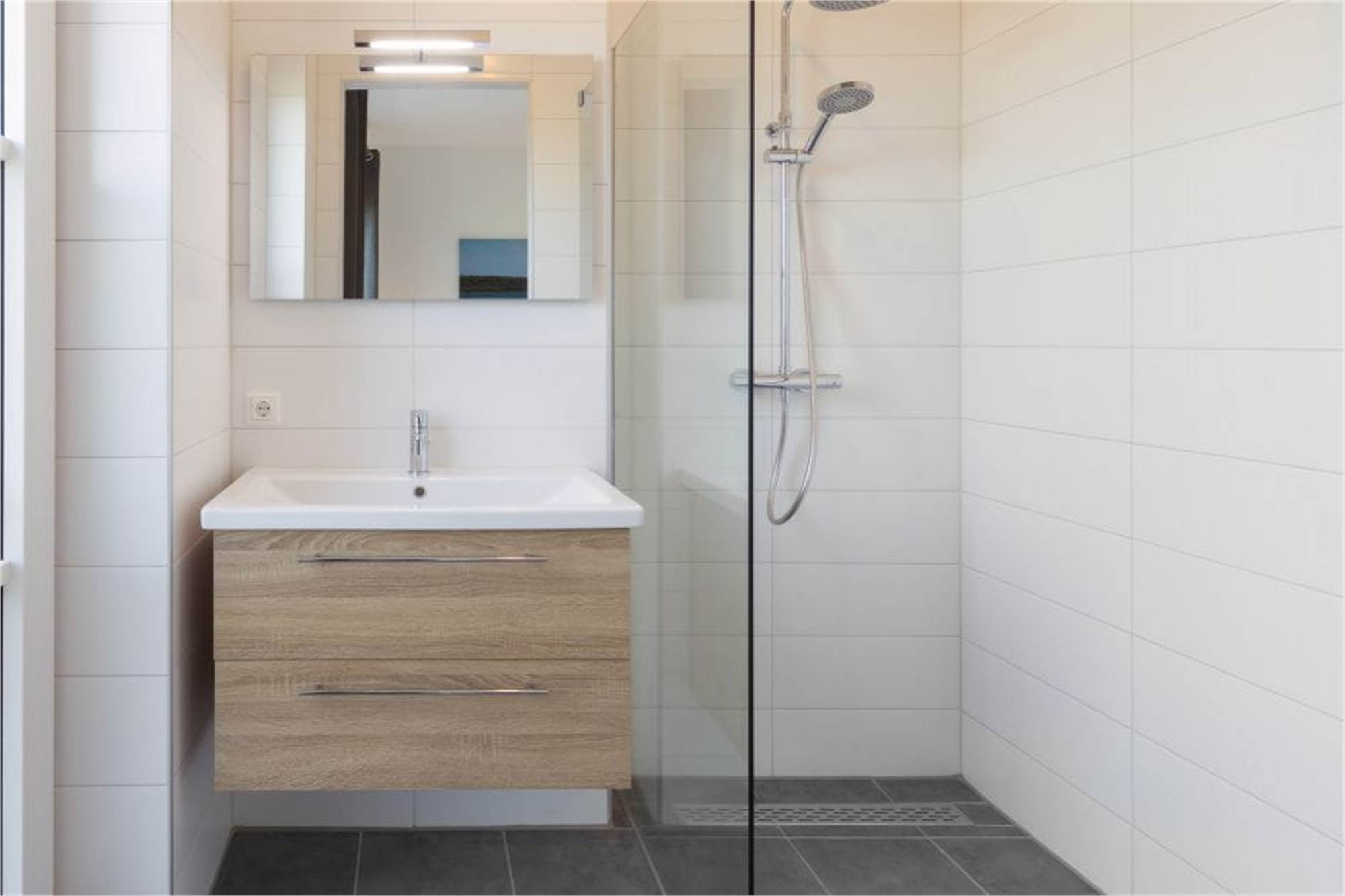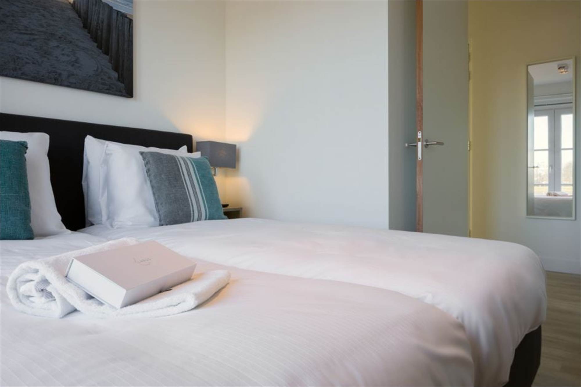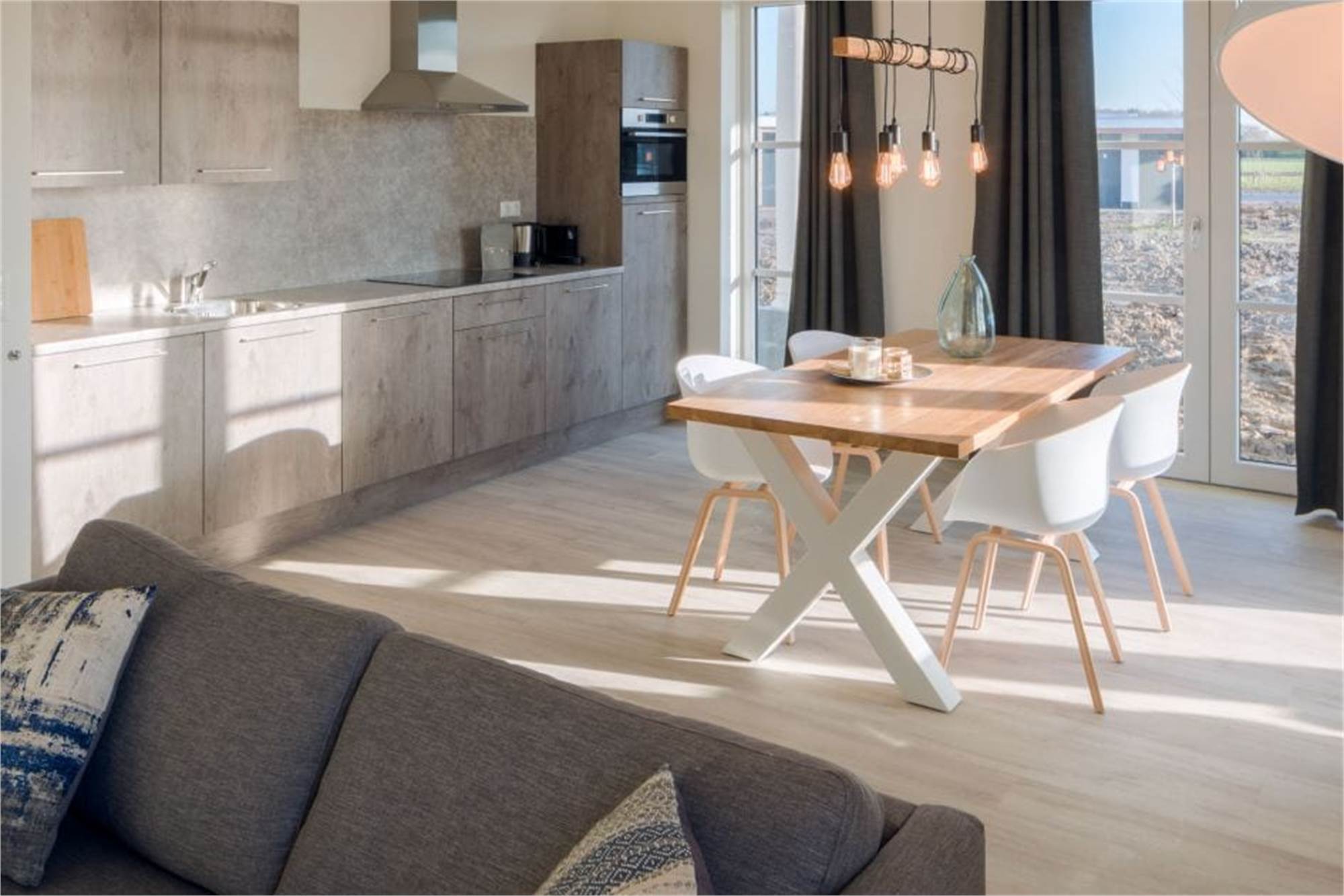Dieses ebenerdige Appartement liegt im Erdgeschoss und eignet sich für 4 Personen. Das Wohnzimmer verfügt über eine Sitzecke mit Smart-TV und grenzt an die offene Küche mit Essecke. In der Küche befinden sich unter anderem eine Geschirrspülmaschine, eine Kombi-Mikrowelle und eine Kaffeepadmaschine. Es sind 2 Schlafzimmer mit jeweils 2 Einzelbetten sowie ein Badezimmer en suite vorhanden. Beide Badezimmer verfügen über eine bodengleiche Regendusche, 1 verfügt zudem über eine eigene Toilette. Die zweite Toilette ist separat und befindet sich im Flur. Außerdem finden Sie hier den Abstellraum mit Waschmaschine und Trockner. Das Appartement besitzt eine überdachte Veranda mit Gartenmobiliar, einen eigenen Garten und einen zentralen Parkplatz in nächster Nähe. Sie können kostenlos das WiFi nutzen.