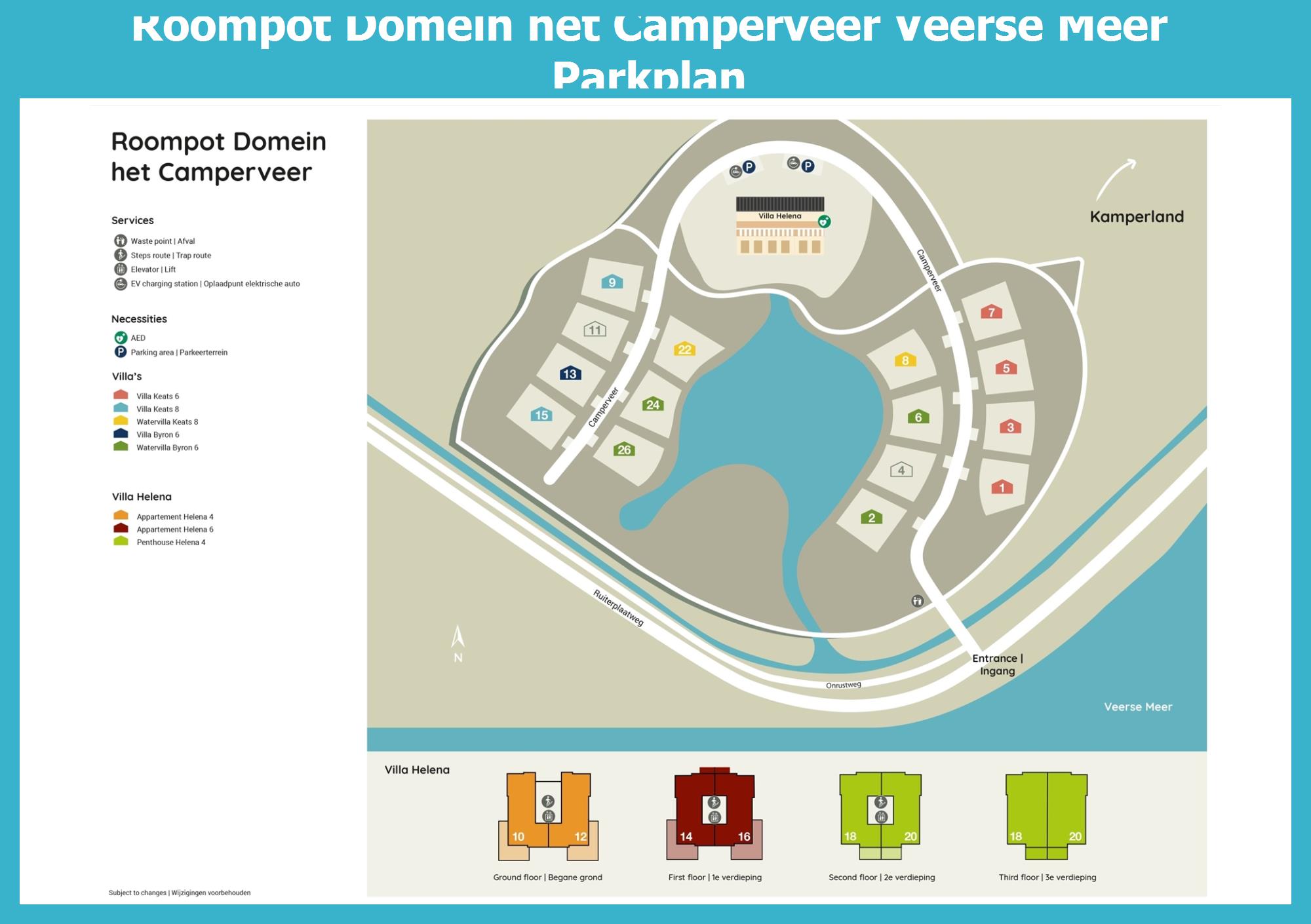 Aktueller und übersichtlicher Parkplan von Roompot Domein het Camperveer Veerse Meer mit alle Unterkünfte und Einrichtungen, auch als PDF herunterladbar.