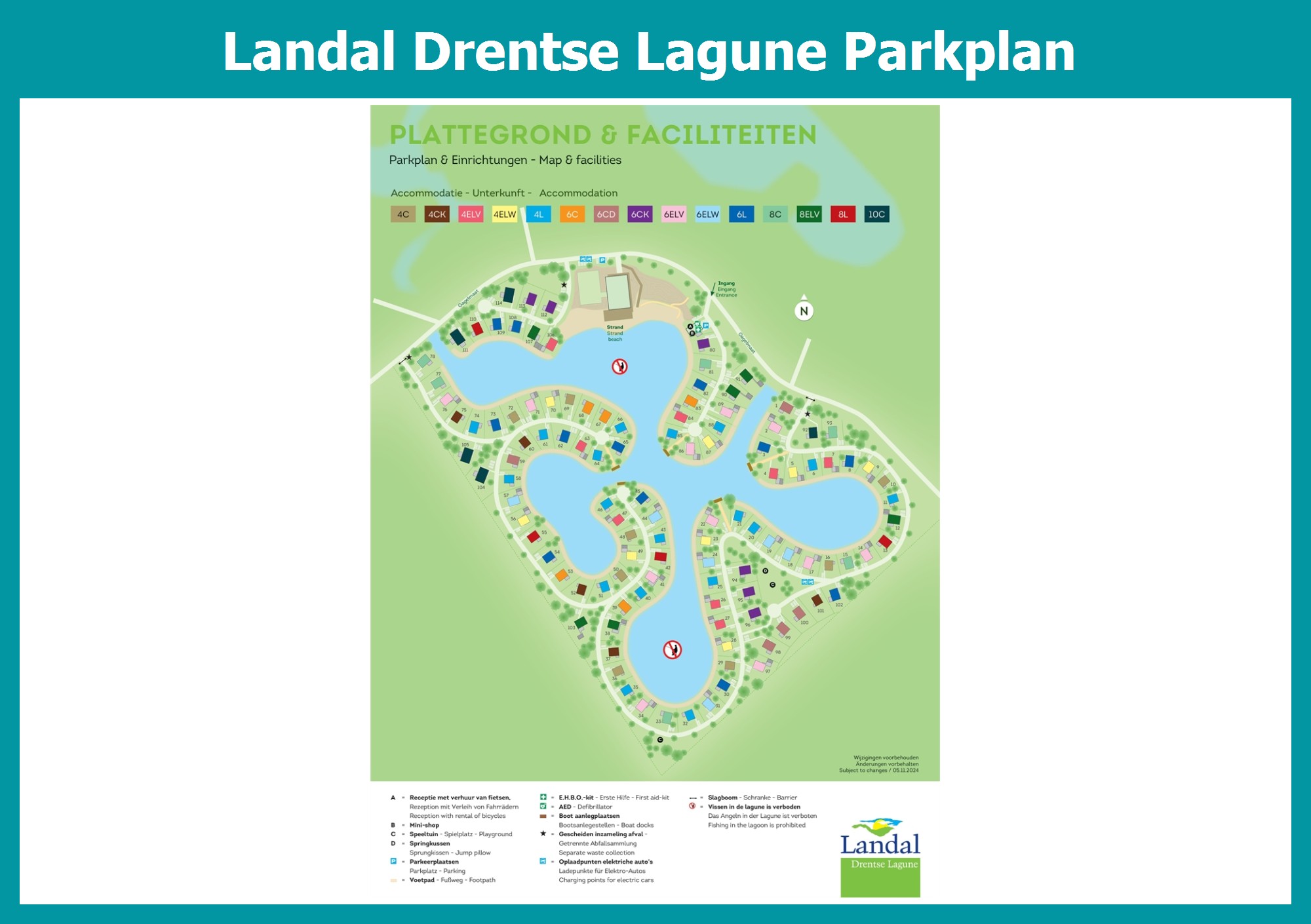 Aktueller und übersichtlicher Parkplan von Landal Drentse Lagune mit alle Unterkünfte und Einrichtungen, auch als PDF herunterladbar.