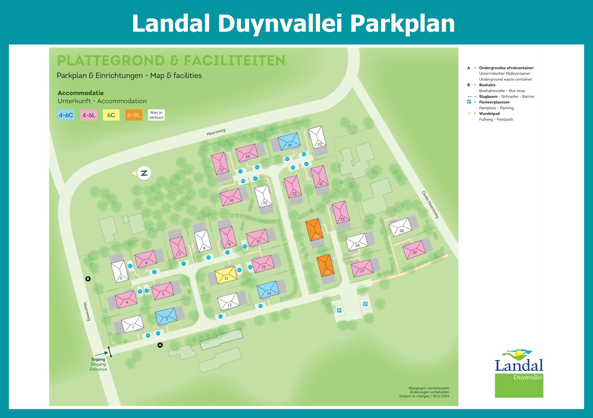 Aktueller und übersichtlicher Parkplan von Landal Duynvallei mit alle Unterkünfte und Einrichtungen, auch als PDF herunterladbar.