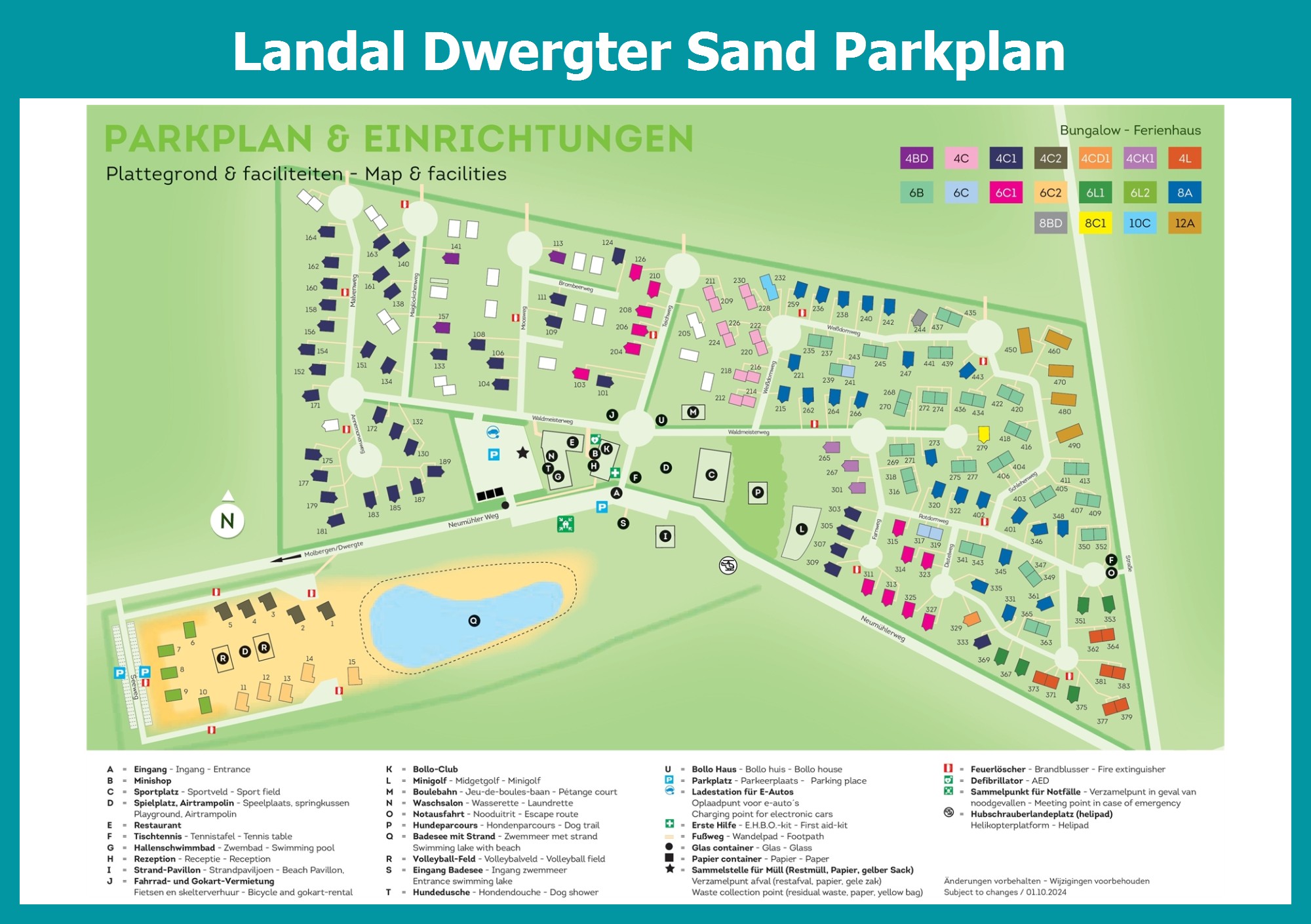 Aktueller und übersichtlicher Parkplan von Landal Dwergter Sand mit alle Unterkünfte und Einrichtungen, auch als PDF herunterladbar.