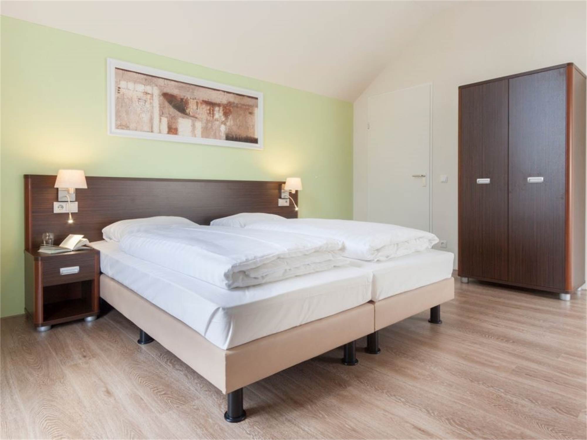 - Zwei Schlafzimmer mit jeweils zwei Boxspring-Einzelbetten