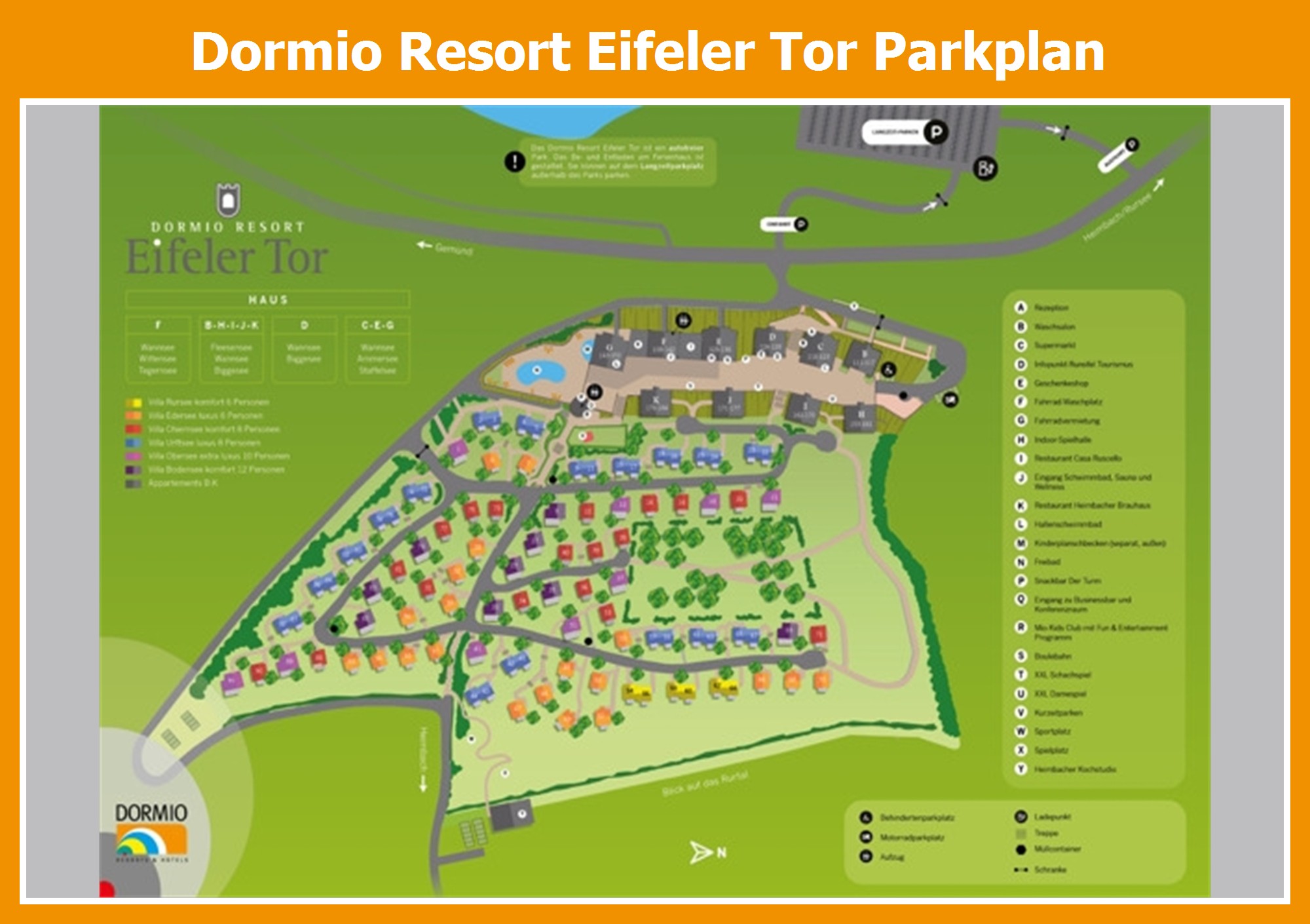 Aktueller und übersichtlicher Parkplan von Dormio Resort Eifeler Tor mit alle Unterkünfte und Einrichtungen, auch als PDF herunterladbar.