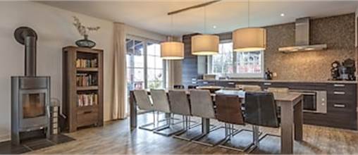 Einteilung: Luxuriöse offene Küche mit u. a. Geschirrspüler und Kombi-Mikrowelle. Sehr großes Wohnzimmer mit Sitz- und Essecke mit Flügeltüren zur Veranda. Offener Kamin innen und außen. Der Kamin außen kann als Grill benutzt werden. Separate Toilette. Zwei Schlafzimmer mit je zwei Einzel-Boxpringbetten mit eigenem Badezimmer mit Dusche und separate Toilette.