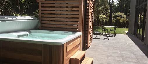 Luxuriöse 4-Personen-Suitelodges mit eigenem WhirlpoolSauna, Außendusche und Grill/ Feuerstelle im Garten. Das ist Genuss im Grünen!