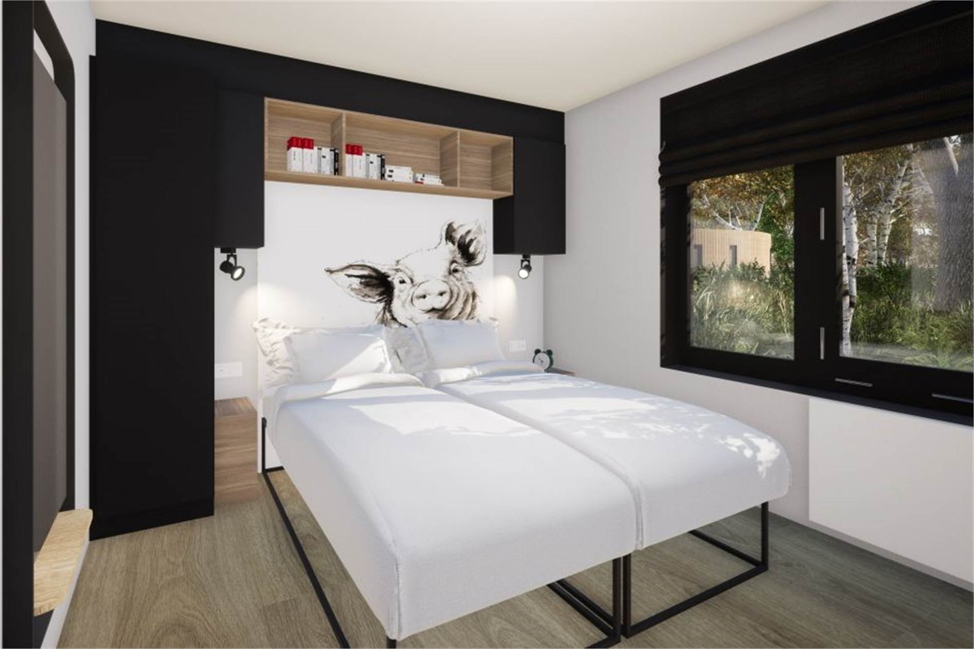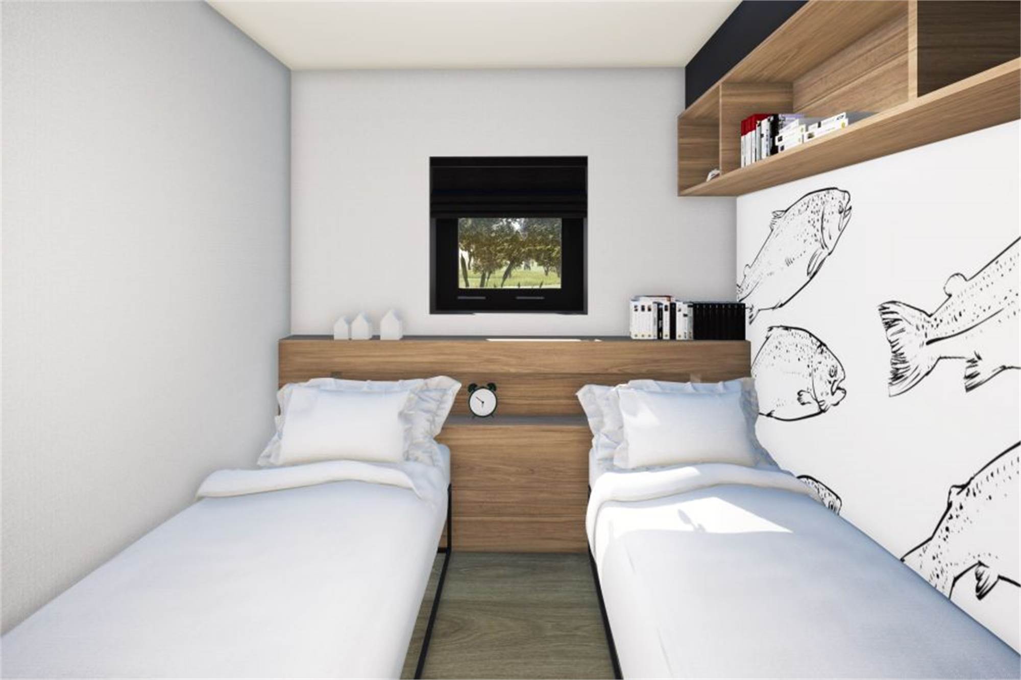 Diese freistehende, ebenerdige Lodge eignet sich für 8 Erwachsene und 1 Baby. Das Wohnzimmer ist mit einer Sitzecke, einer Essecke, einem Fernseher und Fußbodenheizung ausgestattet. Die offene Küche verfügt über einen Geschirrspüler, eine Kaffeekapselmaschine, einen Wasserkocher, eine Kombi-Mikrowelle und eine Kühlgefrierkombination. Das Chalet hat 4 Schlafzimmer mit jeweils 2 Einzelbetten. Die Betten sind mit einer Länge von 210 cm extra lang ausgeführt. Die Lodge ist mit 2 Badezimmern mit einer begehbaren Regendusche und Fußbodenheizung ausgestattet. Eines der Badezimmer ist mit einer Toilette versehen und es ist eine separate Toilette vorhanden. Die Lodge ist mit einem Garten mit Terrasse und Gartenmöbeln ausgestattet. Parkmöglichkeiten befinden sich auf dem zentralen Parkplatz. Es steht kostenloses WiFi zur Verfügung.