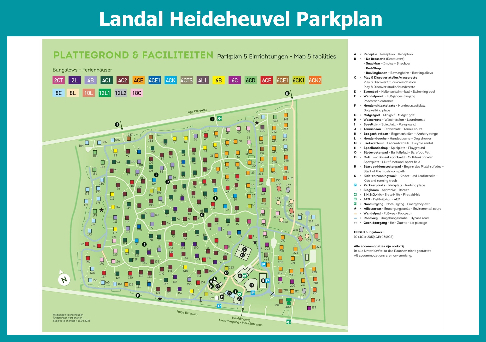 Aktueller und übersichtlicher Parkplan von Landal Heideheuvel mit alle Unterkünfte und Einrichtungen, auch als PDF herunterladbar.