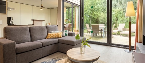 Durch die große Schiebetür wird Ihr Eden-Ferienhaus mit Sonnenlicht durchflutet. Öffnen Sie die Tür - und ihr Wohnzimmer verschmilzt mit dem Garten. Ein Traum! Genießen Sie den großzügigen Freiraum und den Komfort. Entspannen Sie am Kamin und werfen Sie den Grill an - für einen langen Sommerabend.