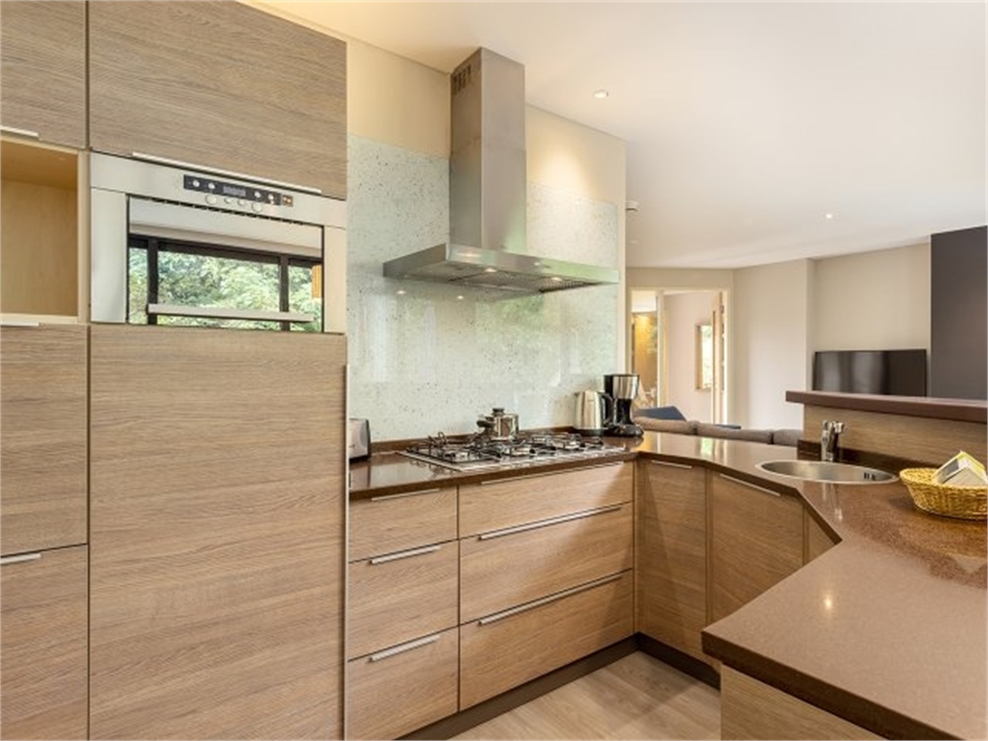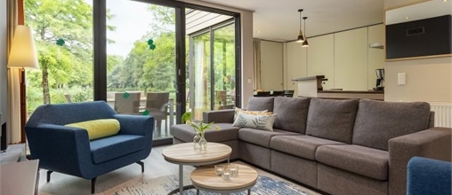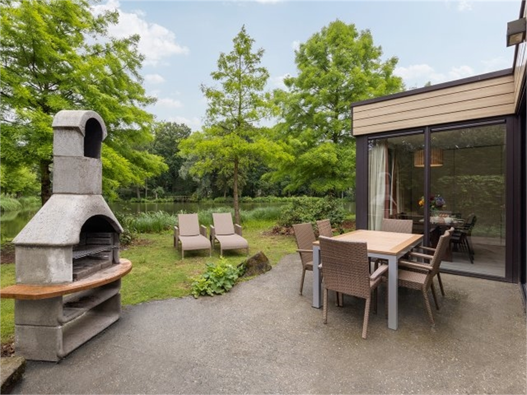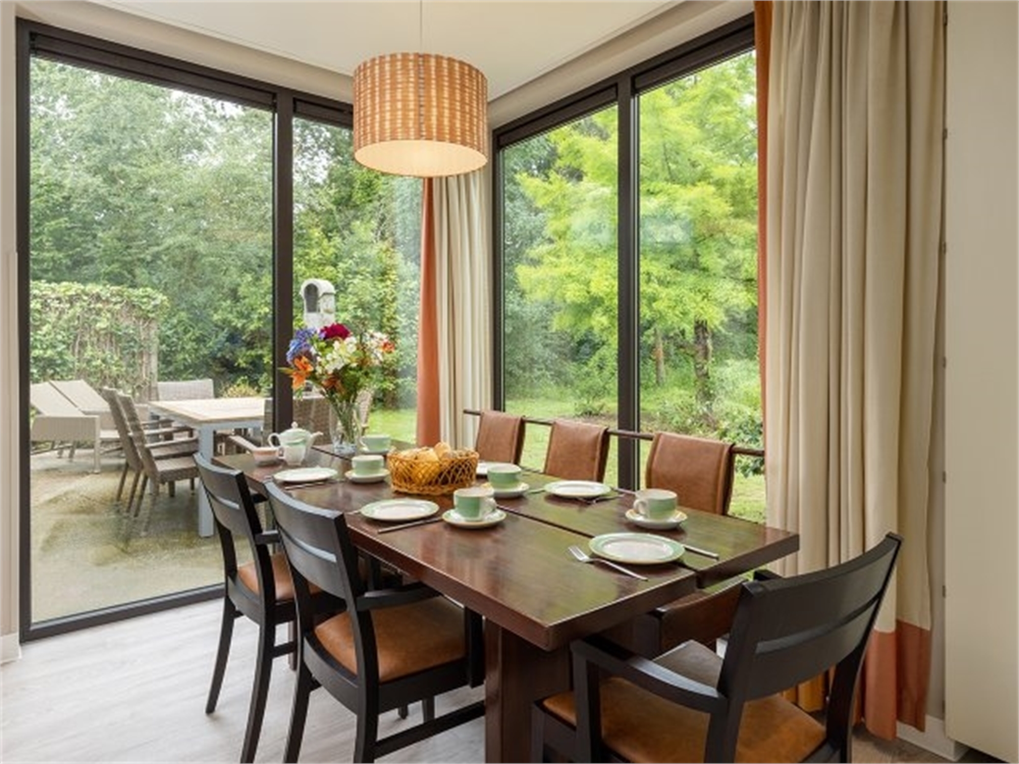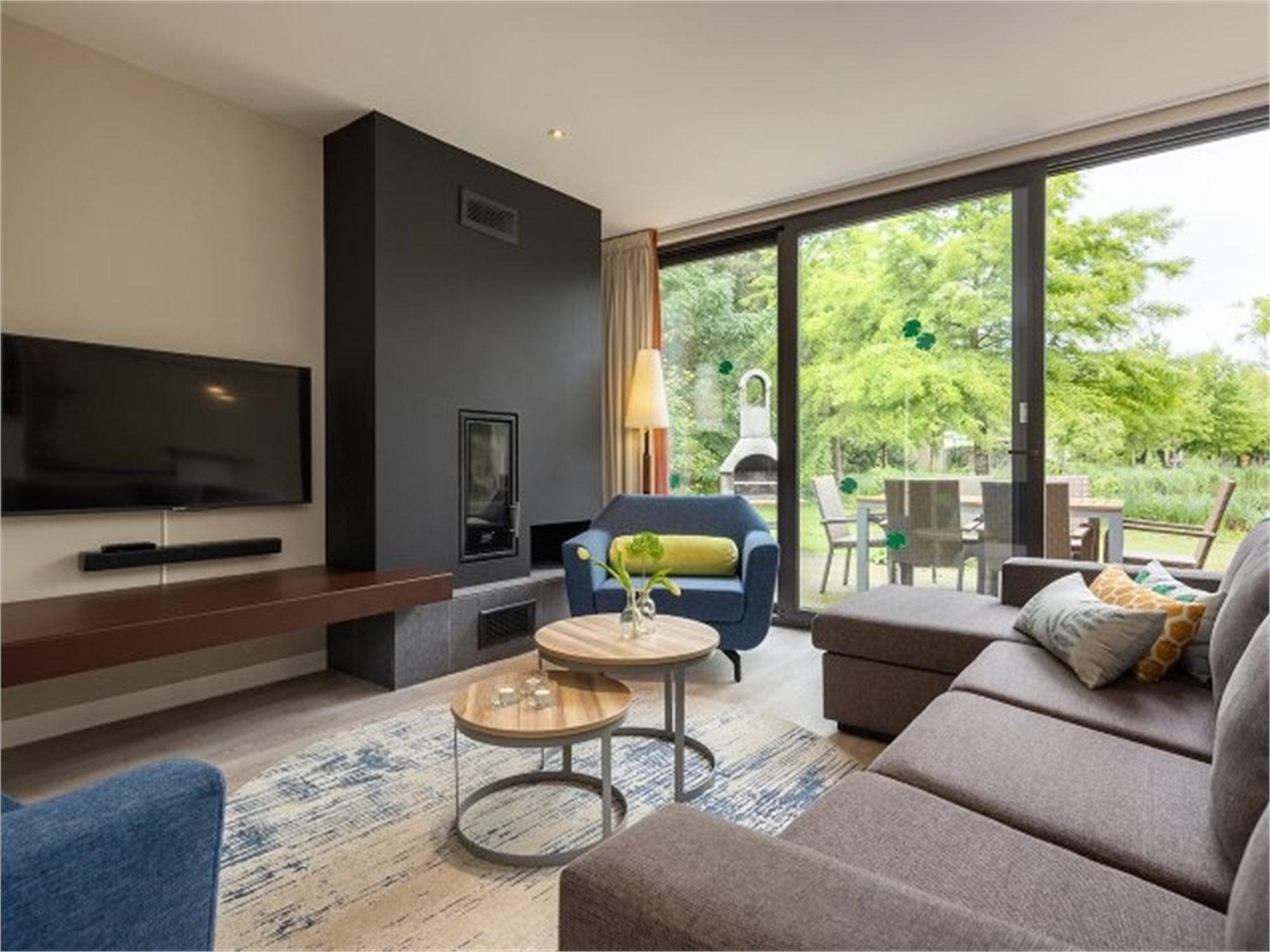Durch die große Schiebetür wird Ihr Eden-Ferienhaus mit Sonnenlicht durchflutet. Öffnen Sie die Tür - und ihr Wohnzimmer verschmilzt mit dem Garten. Ein Traum! Genießen Sie den großzügigen Freiraum und den Komfort. Entspannen Sie am Kamin und werfen Sie den Grill an - für einen langen Sommerabend.