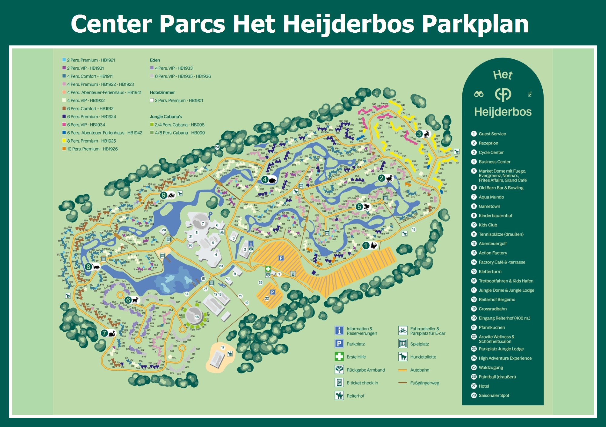Aktueller und übersichtlicher Parkplan von Center Parcs Het Heijderbos mit alle Unterkünfte und Einrichtungen, auch als PDF herunterladbar.