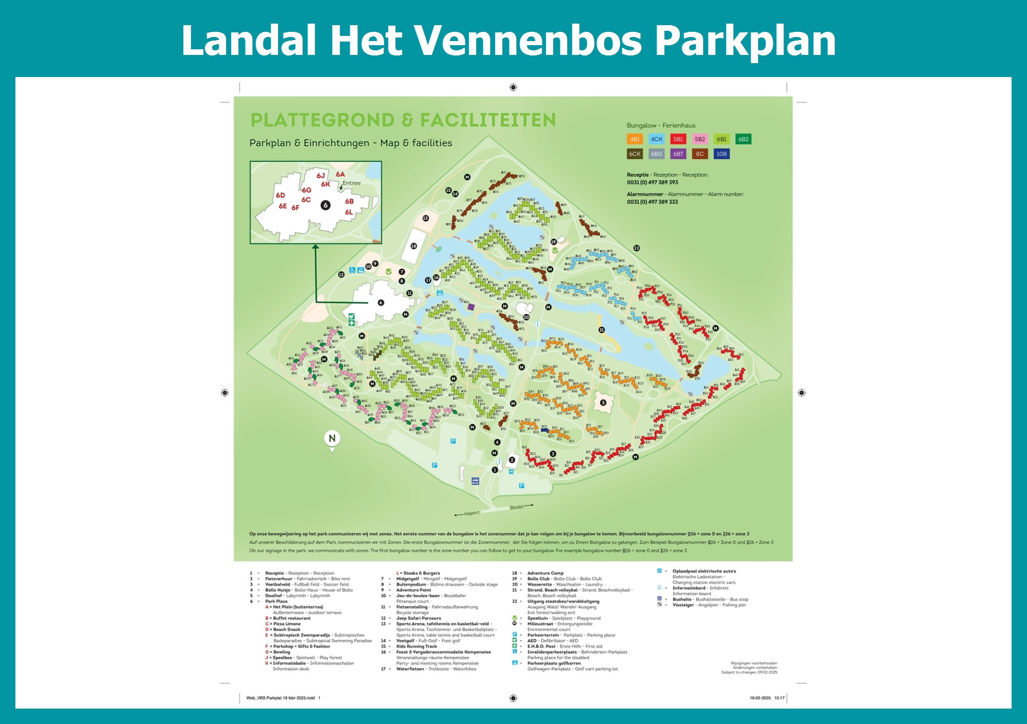 Aktueller und übersichtlicher Parkplan von Landal Het Vennenbos mit alle Unterkünfte und Einrichtungen, auch als PDF herunterladbar.