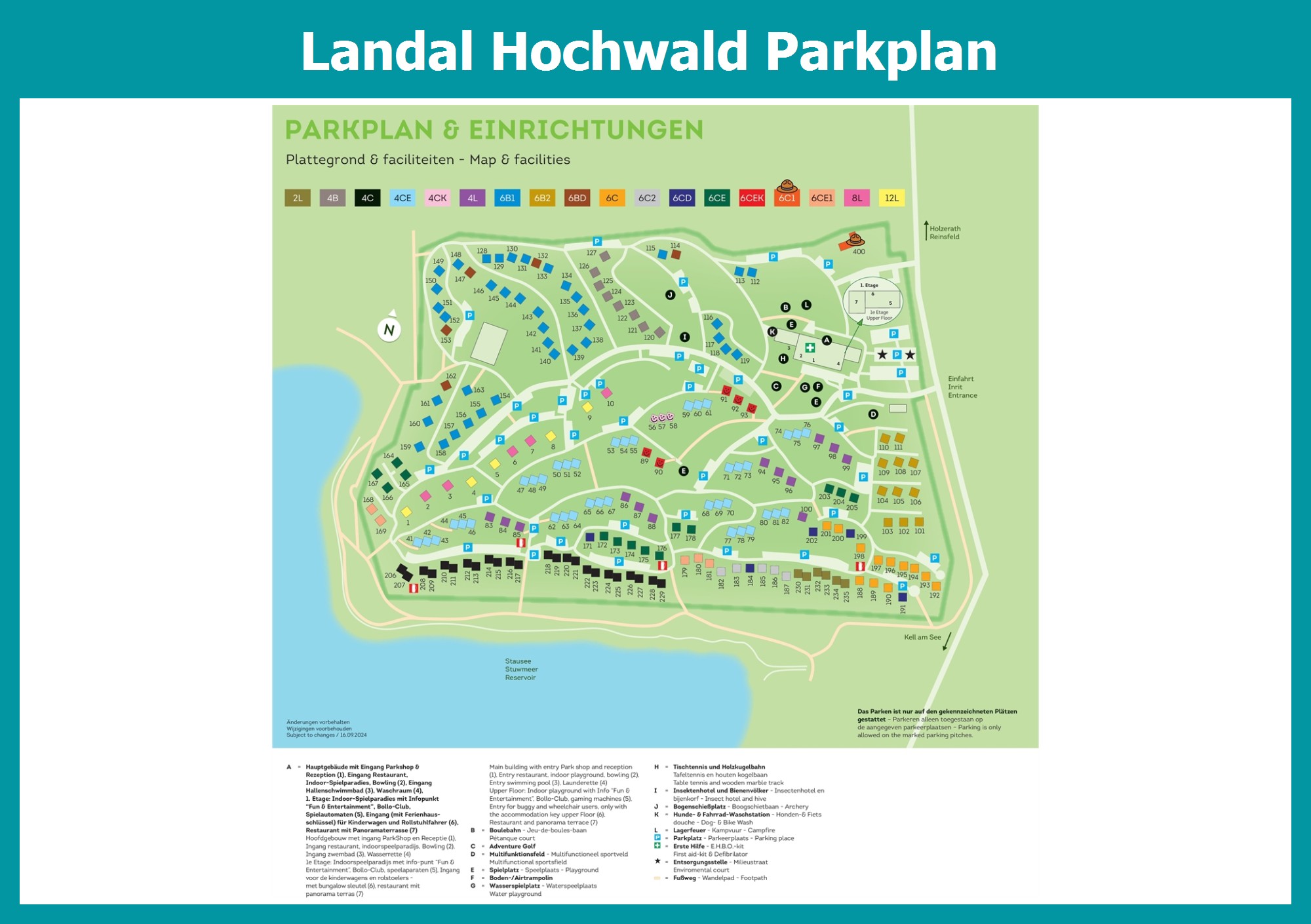 Aktueller und übersichtlicher Parkplan von Landal Hochwald mit alle Unterkünfte und Einrichtungen, auch als PDF herunterladbar.