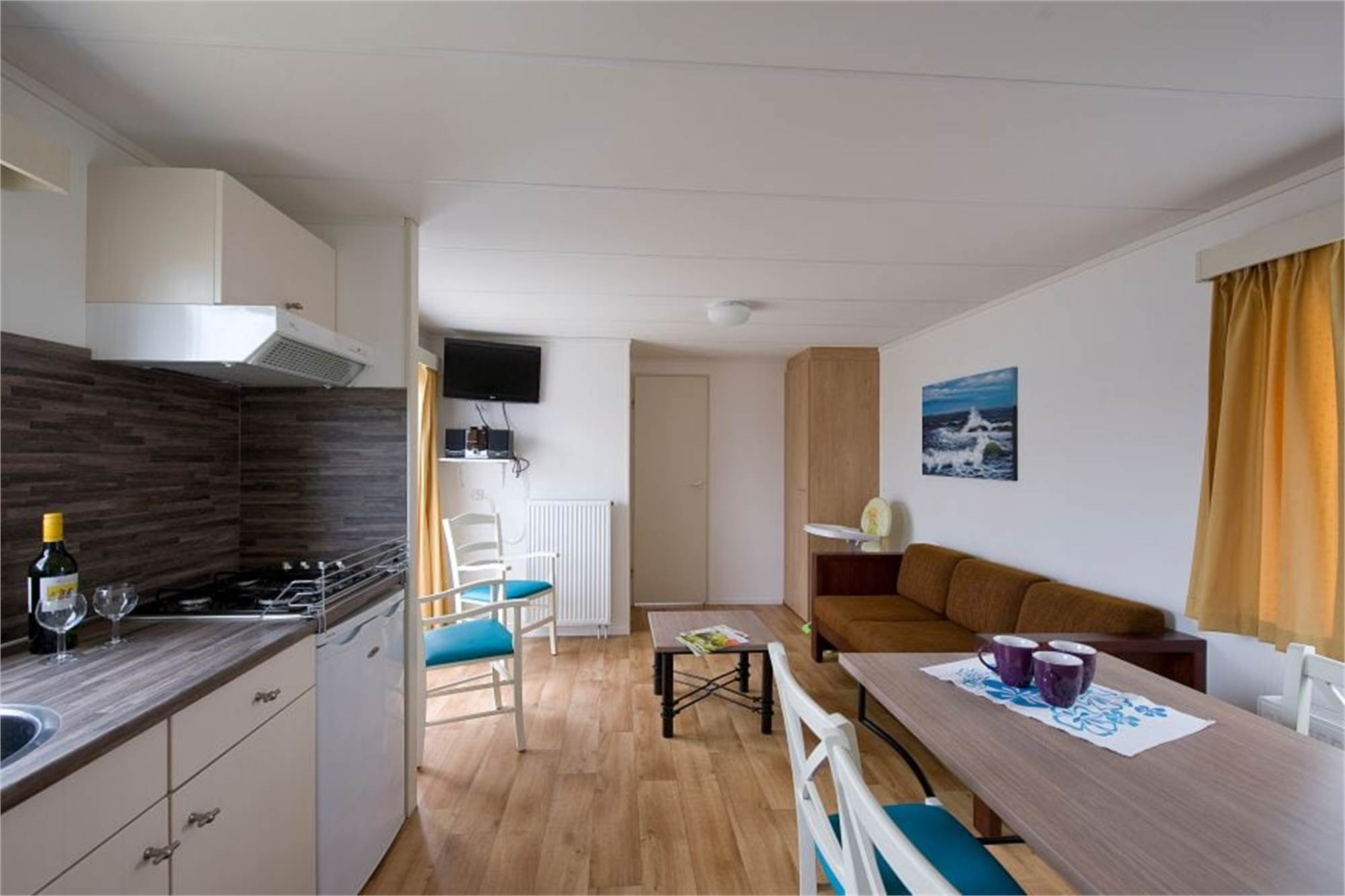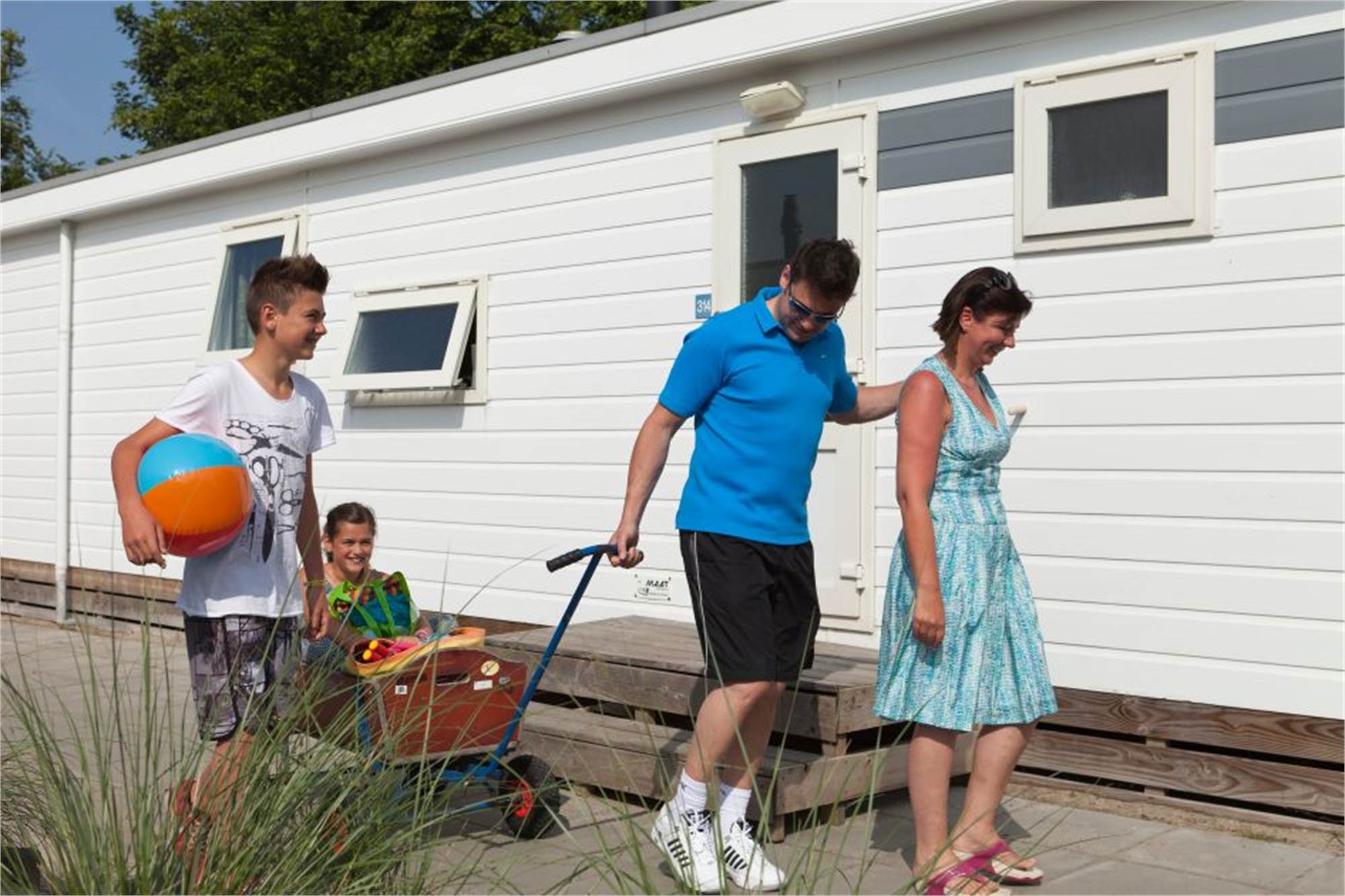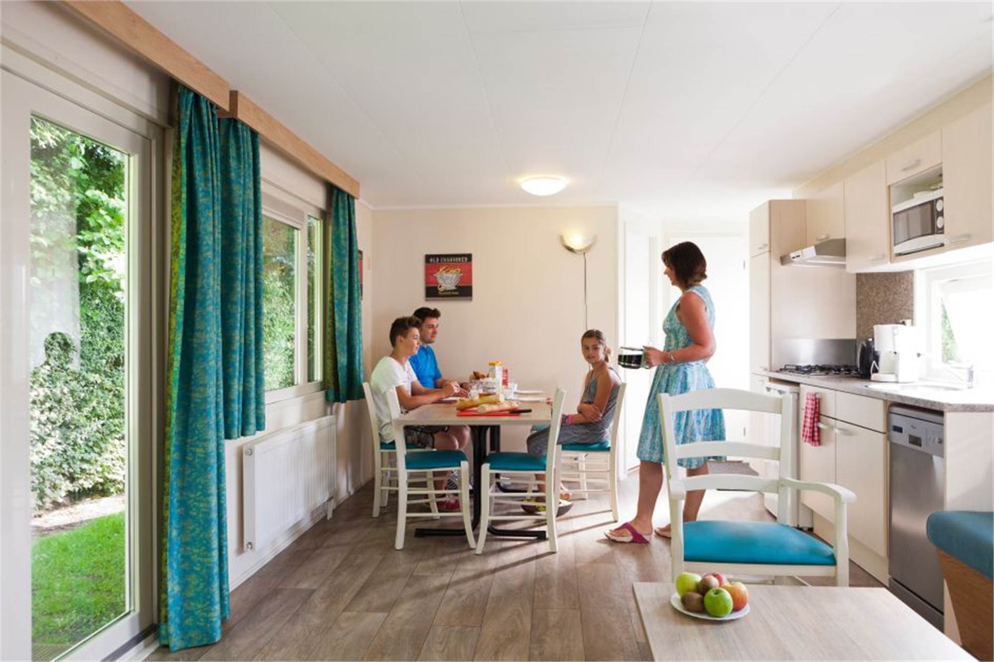 Dieses freistehende ebenerdige und kinderfreundliche Chalet eignet sich für 5 Personen und 1 Baby. Die Unterkunft bietet ein freundlich eingerichtetes Wohnzimmer mit gemütlicher Sitzecke und TV-Gerät. Die offene Küche ist u. a. mit Geschirrspüler, Mikrowelle und Filterkaffeemaschine ausgestattet. Darüber hinaus verfügt das Chalet über 3 Schlafzimmer, davon eins mit Etagenbett, eins mit 2 Einzelbetten und eins mit Einzelbett und Kinderbettchen. Außerdem gibt es ein Badezimmer mit Dusche und Toilette und im Außenbereich einen Garten mit möblierter Terrasse. Die Unterkunft ist besonders kinderfreundlich eingerichtet und bietet ein, Campingbett, einen Kinderstuhl, einen kindersicheren Herd, kindersichere Steckdosen und einen umzäunten Garten.