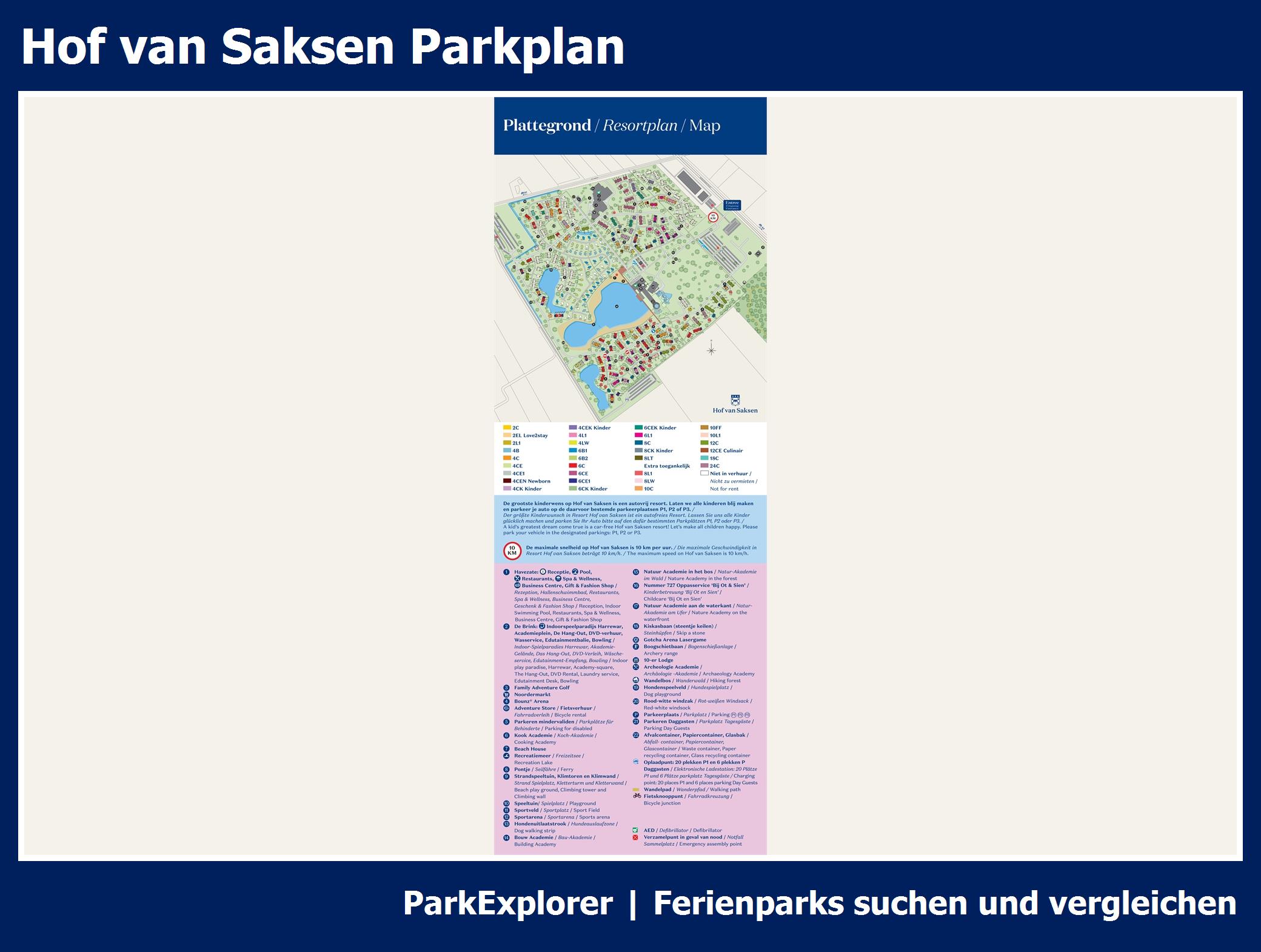 Aktueller und übersichtlicher Parkplan von Hof van Saksen mit alle Unterkünfte und Einrichtungen, auch als PDF herunterladbar.