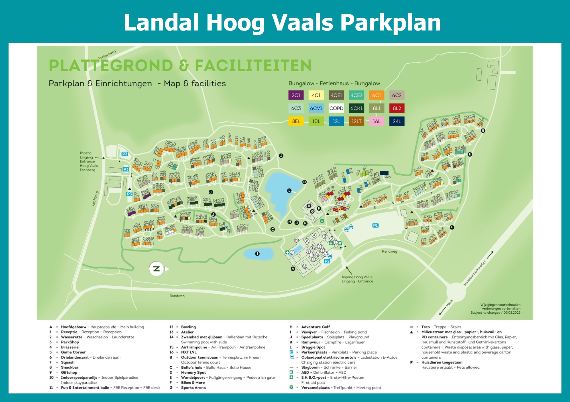 Aktueller und übersichtlicher Parkplan von Landal Hoog Vaals mit alle Unterkünfte und Einrichtungen, auch als PDF herunterladbar.