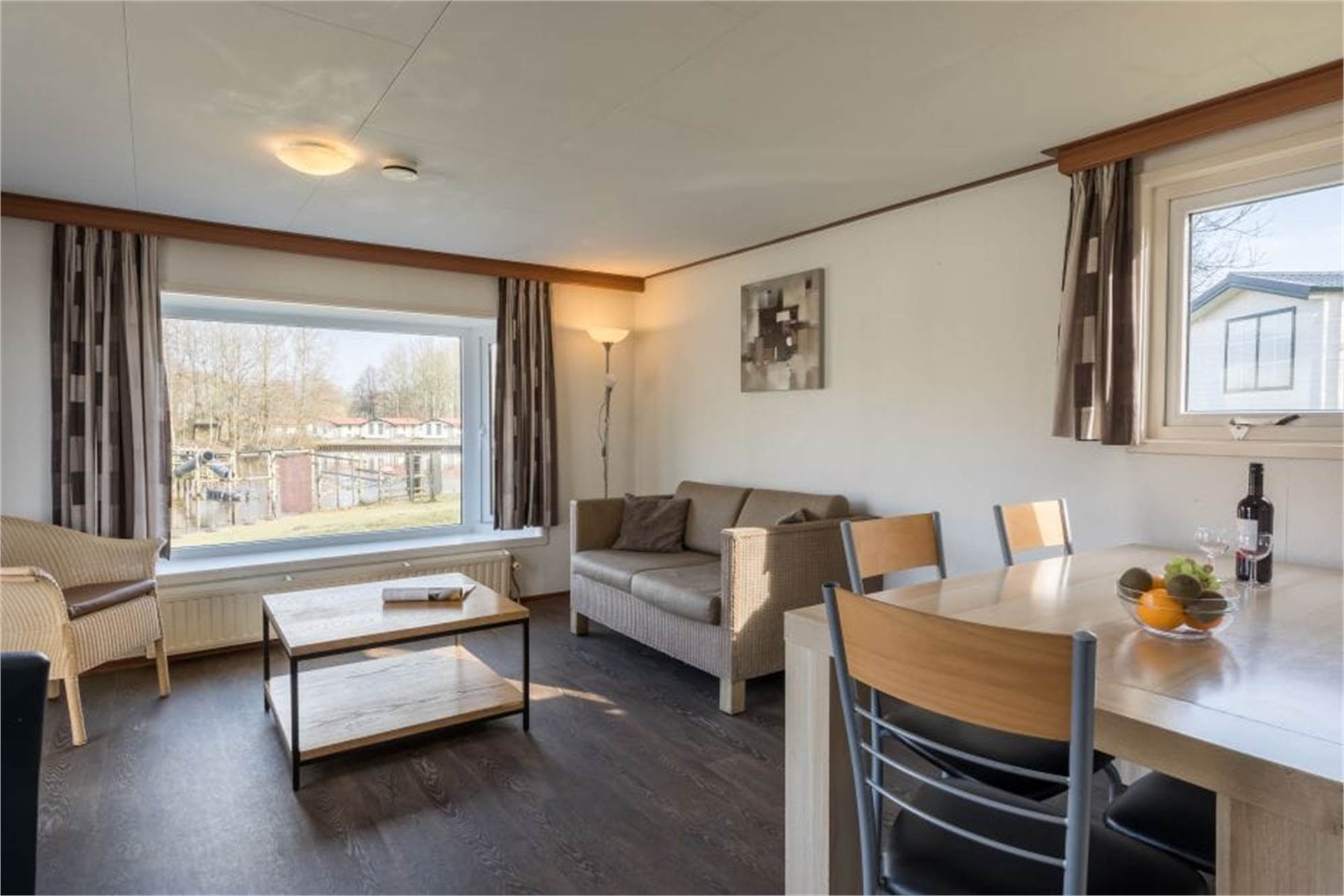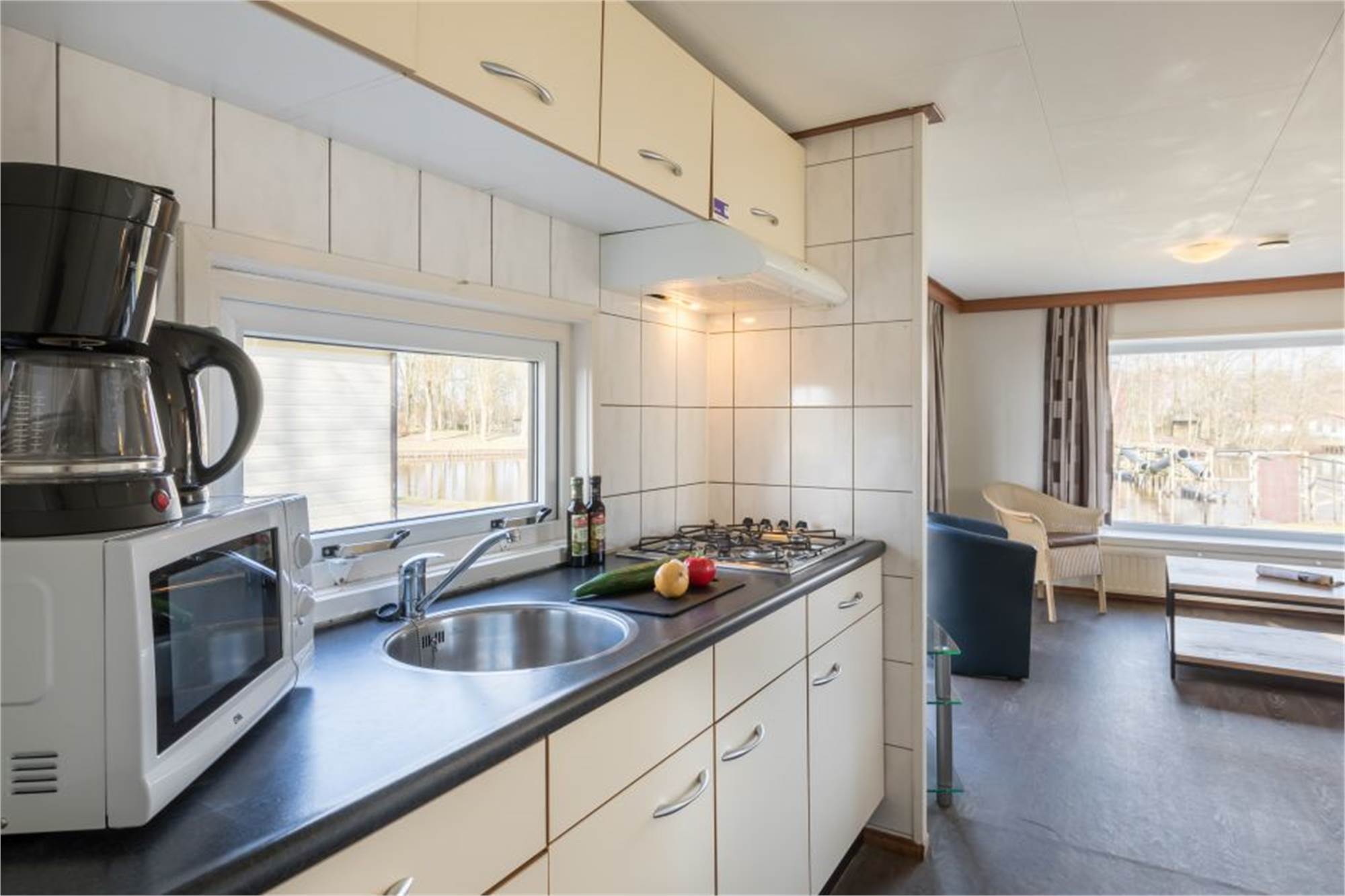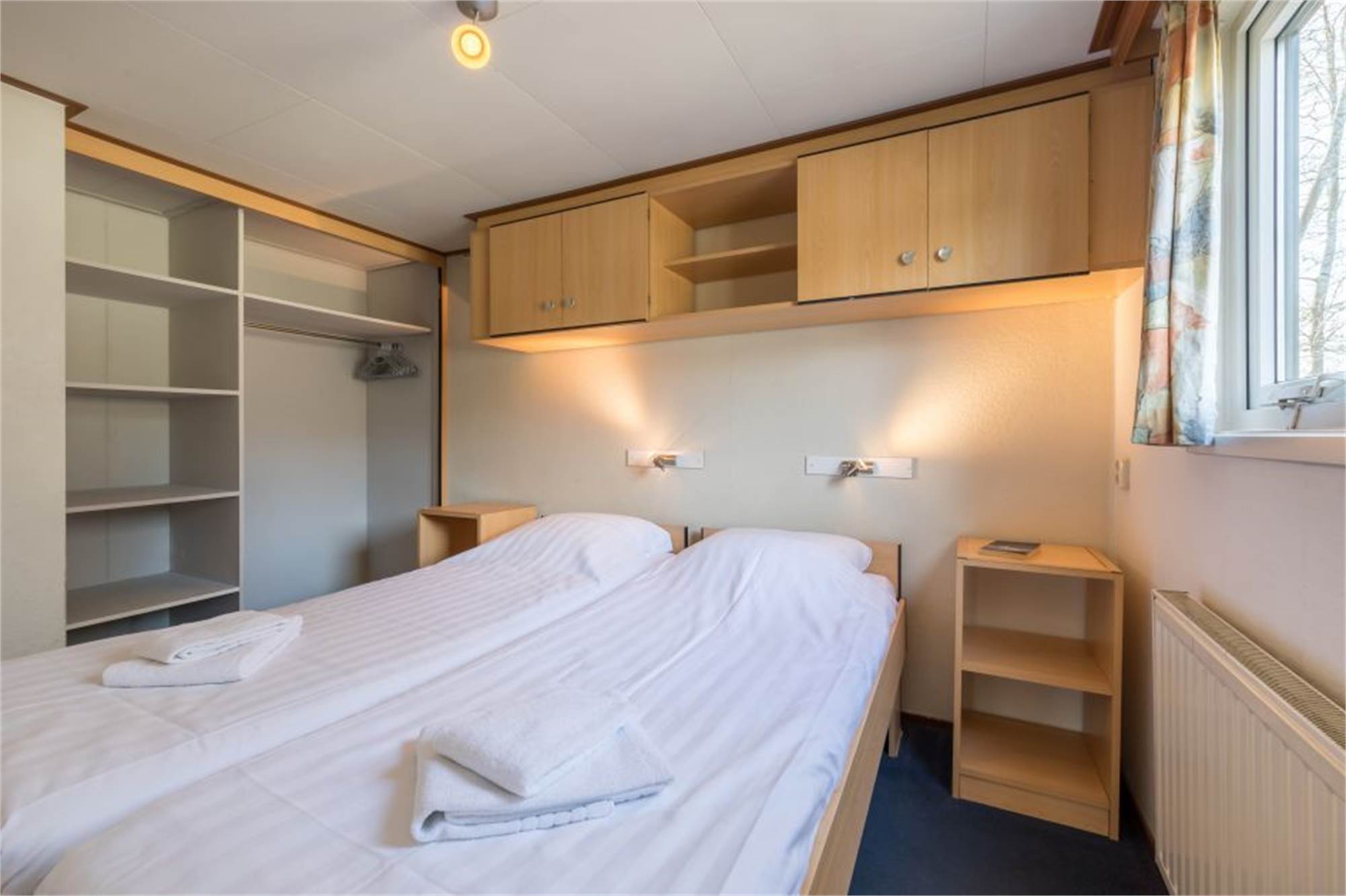 Dieses freistehende, ebenerdige Chalet eignet sich für 5 Personen. Das Chalet verfügt über ein Wohnzimmer mit TV-Gerät und eine offene Küche mit Mikrowelle, Kühlschrank und Kaffeemaschine. Es gibt 2 Schlafzimmer, zwei davon 1 mit 2 Einzelbetten und 1 mit Etagenbett sowie ein Badezimmer mit Dusche und Toilette. Im Außenbereich finden Sie eine möblierte Terrasse und Parkmöglichkeiten in der Nähe der Unterkunft. Die Nutzung von WiFi ist gratis.