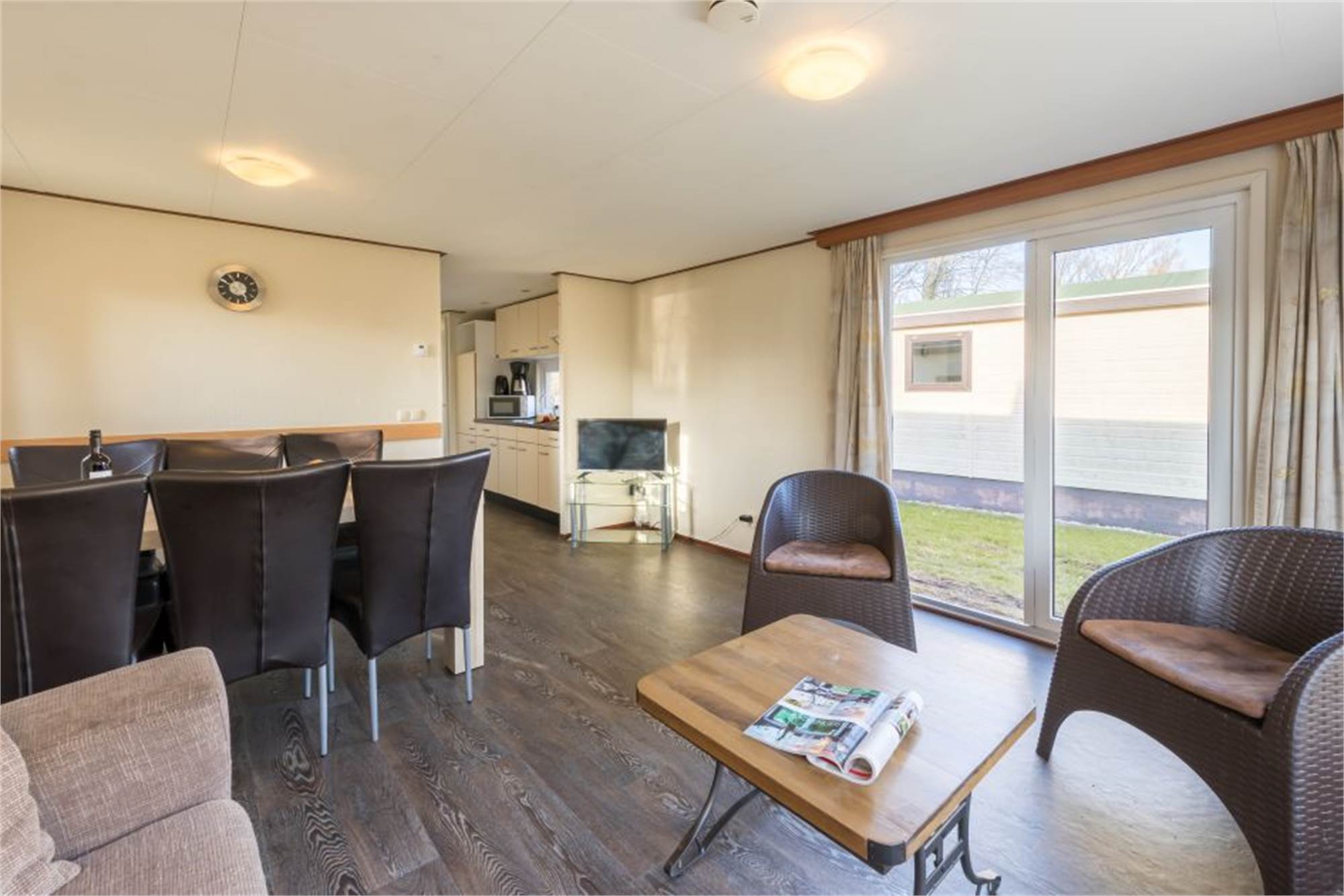 Dieses freistehende, ebenerdige Chalet eignet sich für 6 Personen. Das Chalet verfügt über ein Wohnzimmer und eine offene Küche mit Mikrowelle, Kühlschrank und Kaffeemaschine. Es gibt 3 Schlafzimmer, zwei davon mit 2 Einzelbetten und eins mit Doppelbett sowie ein Badezimmer mit Dusche und Toilette. Im Außenbereich finden Sie eine möblierte Terrasse und die Nutzung von WiFi ist gratis.