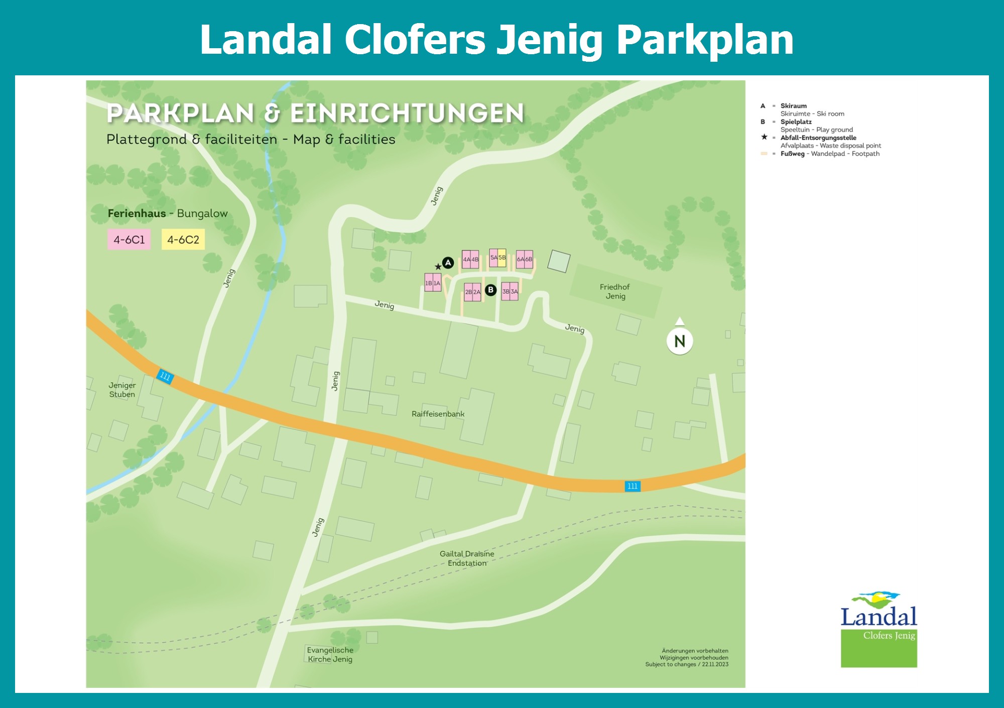 Aktueller und übersichtlicher Parkplan von Landal Clofers Jenig mit alle Unterkünfte und Einrichtungen, auch als PDF herunterladbar.