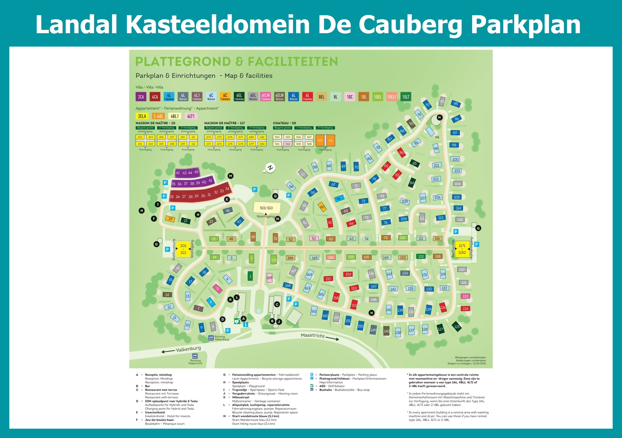 Aktueller und übersichtlicher Parkplan von Landal Kasteeldomein De Cauberg mit alle Unterkünfte und Einrichtungen, auch als PDF herunterladbar.