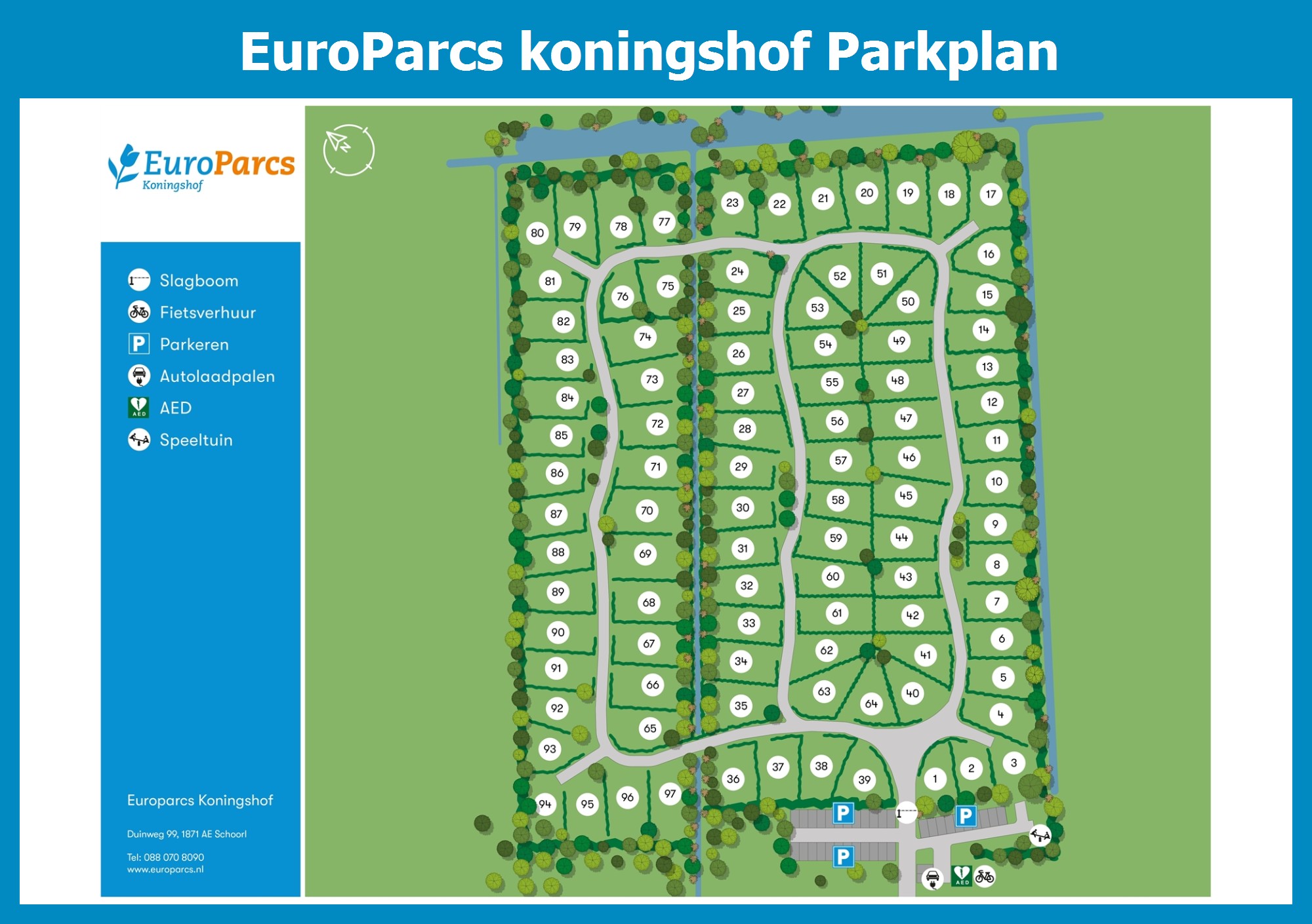 Aktueller und übersichtlicher Parkplan von EuroParcs koningshof mit alle Unterkünfte und Einrichtungen, auch als PDF herunterladbar.