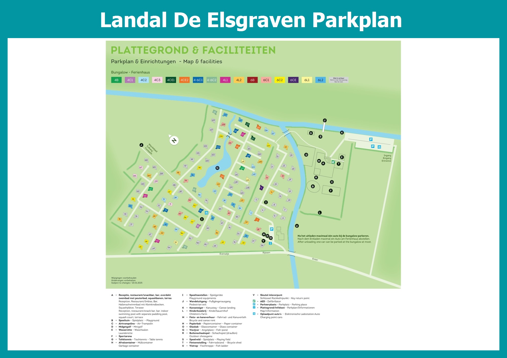 Aktueller und übersichtlicher Parkplan von Landal De Elsgraven mit alle Unterkünfte und Einrichtungen, auch als PDF herunterladbar.